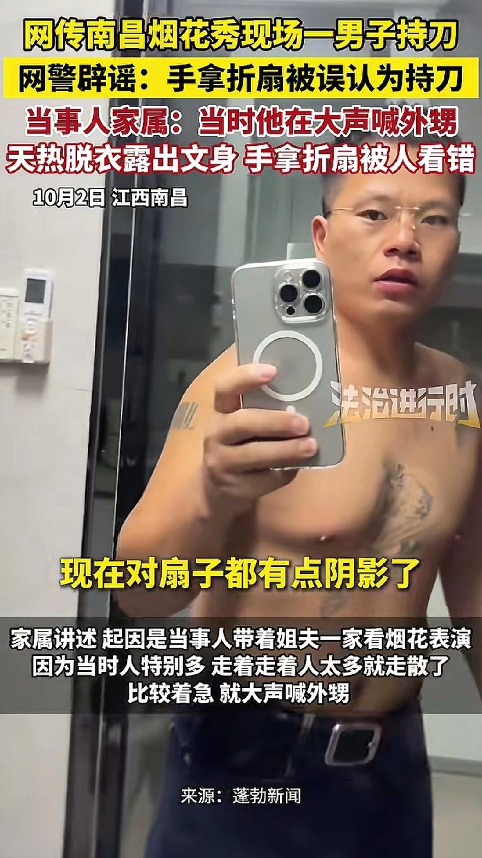 江西南昌县烟花秀场上,一勇士猛冲夺下武器,另一勇士猛冲朝对方屁股猛踹一脚,将之踹倒,接着众多好汉蜂拥而上将他按倒。被抢了折扇,又被别人一脚踹屁股上,倒地还没来得及起来,又看见很多人朝自己打来,男人还没从懵圈中醒来,就本能双手护头蹲下,让人制服。 起因是男子带着姐夫一家看烟花表演,因为当时人特别多,太热了,就把穿的长袖脱了,露出了手臂上和胸前的纹身,手拿折扇扇风。但是,男子和姐夫一家走着走着就走散了,比较着急的情况下,就大声喊外甥,突然后面一个人抢走他的扇子,又一个把他踹到地上翻滚一圈,等他反应过来就有一群人对他拳打脚踢,场面已经完全失控,出于本能只能先抱着头防止头部受伤。后民警介入,男子和部分见义勇为的勇士被带离现场,经询问是一场乌龙,因为大家把男子的折扇当做了武器,加之理解错了男子口里喊的内容,再加之男子身上的纹身,就被大家认为是坏人。 正如网友所说,被人误解挨打是有原因的:拿把扇子被误以为是一把刀,光着上身和光膀子露出了纹身,大喊大叫被广大人民群众误以为精神错乱。 更有网友认为,他就是个矛盾体:你说天热吧,他要穿长袖!你说天冷吧,他要拿把扇子。你说他没素质吧,外甥走散了,他还知道拼命喊着找!你说他有素质吧,身上纹几个皮皮虾,几万人的马路上,非要把上衣脱了。 男人一定后悔纹了纹身!去洗了吧!
