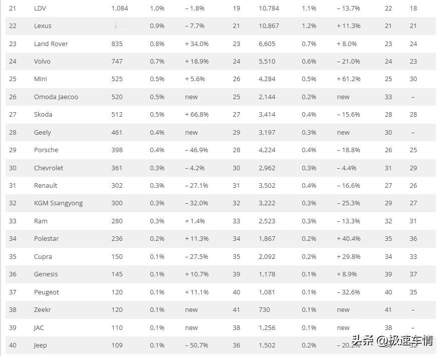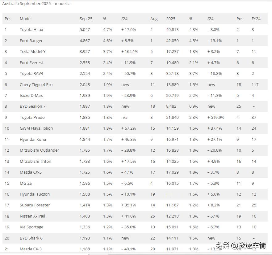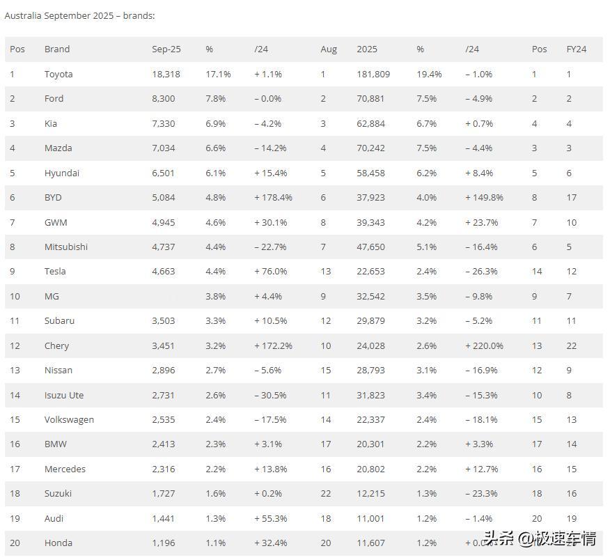 9月,澳洲车市继续保持增长,中国品牌继续保持高增长。比亚迪、长城、奇瑞、名爵的突破显示中国汽车在澳州的影响力继续逐步提升中。 2025年9月,澳大利亚新车销量同比增长7%,至106,891辆。 2025年1-9月,累计销量同比微增0.3%,至938,959辆。 中国品牌表现出色: 比亚迪:5084辆,市占率4.8%,第六名。 长城:4945辆,市占率4.6%,第七名。 名爵:4011辆,市占率3.8%,第十名。 奇瑞:3451辆,市占率3.2%,第十二名。 上汽LDV:1084辆,市占率1%。 奇瑞Omoda&Jaecoo:520辆,市占率0.5%。 吉利:461辆,市占率0.4%。 极氪:120辆,市占率0.1%。 江淮:110辆,市占率0.1%。 汽车原产国格局:中国产保持稳定增长 日本产汽车:销量下降 6.4%,至 26,590 辆。 泰国产汽车:销量下降 7.4%,至 20,996 辆。 中国产汽车:销量增长 66.9%,至 20,958 辆,市场份额占比达 19.6%。 韩国产汽车:销量下降 6.5%。 德国产汽车:销量下降 7.1%,至 4,518 辆。