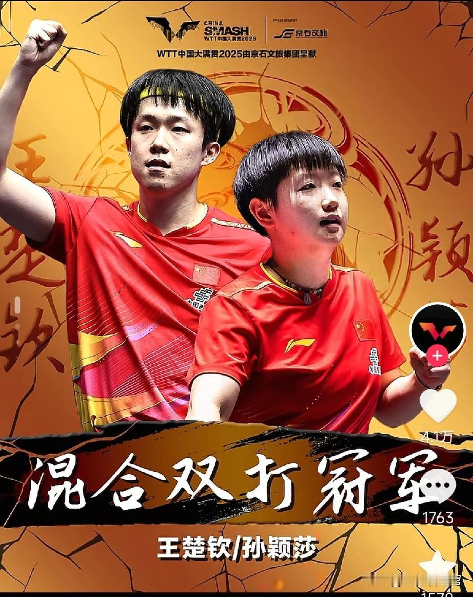 王楚钦+孙颖莎上演1+1=1的奇迹,今夜无眠啊,王楚钦男子乒乓球世界第一,孙颖莎女子乒乓球世界第一,两个人组合还是世界第一,数字看起来很简单,但是做到1+1=1可没那么容易,不是谁都能做到的。 说实话,王楚钦和孙颖莎二人组合夺得混双冠军就是实至名归,3:0战胜对手,看起来二人还没尽到全力,二人组合实力遥遥领先,对手连赢一盘都成了奢望。 实力和默契,等于所向披靡。 于是,1+1=1就诞生了,结果仅仅是个最简单的数字,简单的数字背后是别人看不到的汗水。 祝贺她们,祝福她们,我们永远的骄傲!