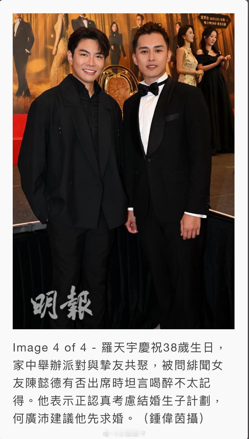 羅天宇剛過38歲生日,於家中舉辦派對邀請摯友共聚。被問及緋聞女友陳懿德有否出席時,他尷尬地回應:「好像有吧,不太記得了,因為當晚喝醉了。」他坦言這個年紀差不多要考慮婚姻大事,母親雖然非常喜愛小孩,但並未施壓。他表示:「若想成為父親,年紀也不能太大,確實需要認真考慮,畢竟需要資金,所以要更努力掙錢。」何廣沛建議他先行求婚。何廣沛被問及婚禮籌備進度時說:「一定會在明年舉行,目前正研究合適的日子,希望能配合圈中好友的時間,讓他們一同見證這重要時刻。」
