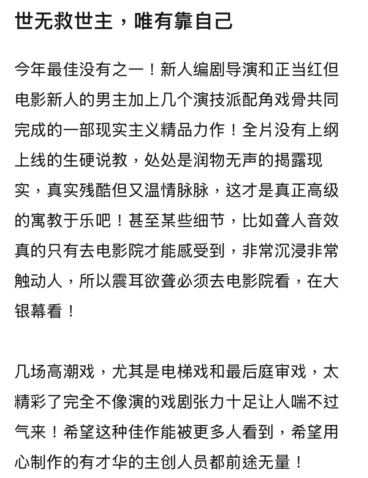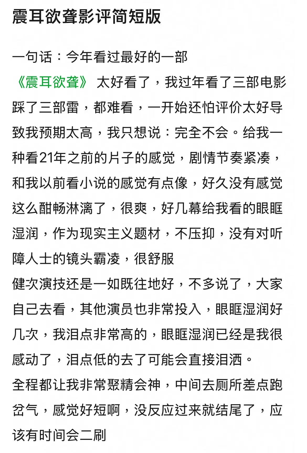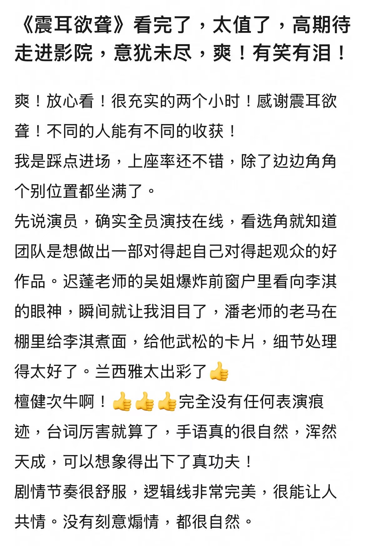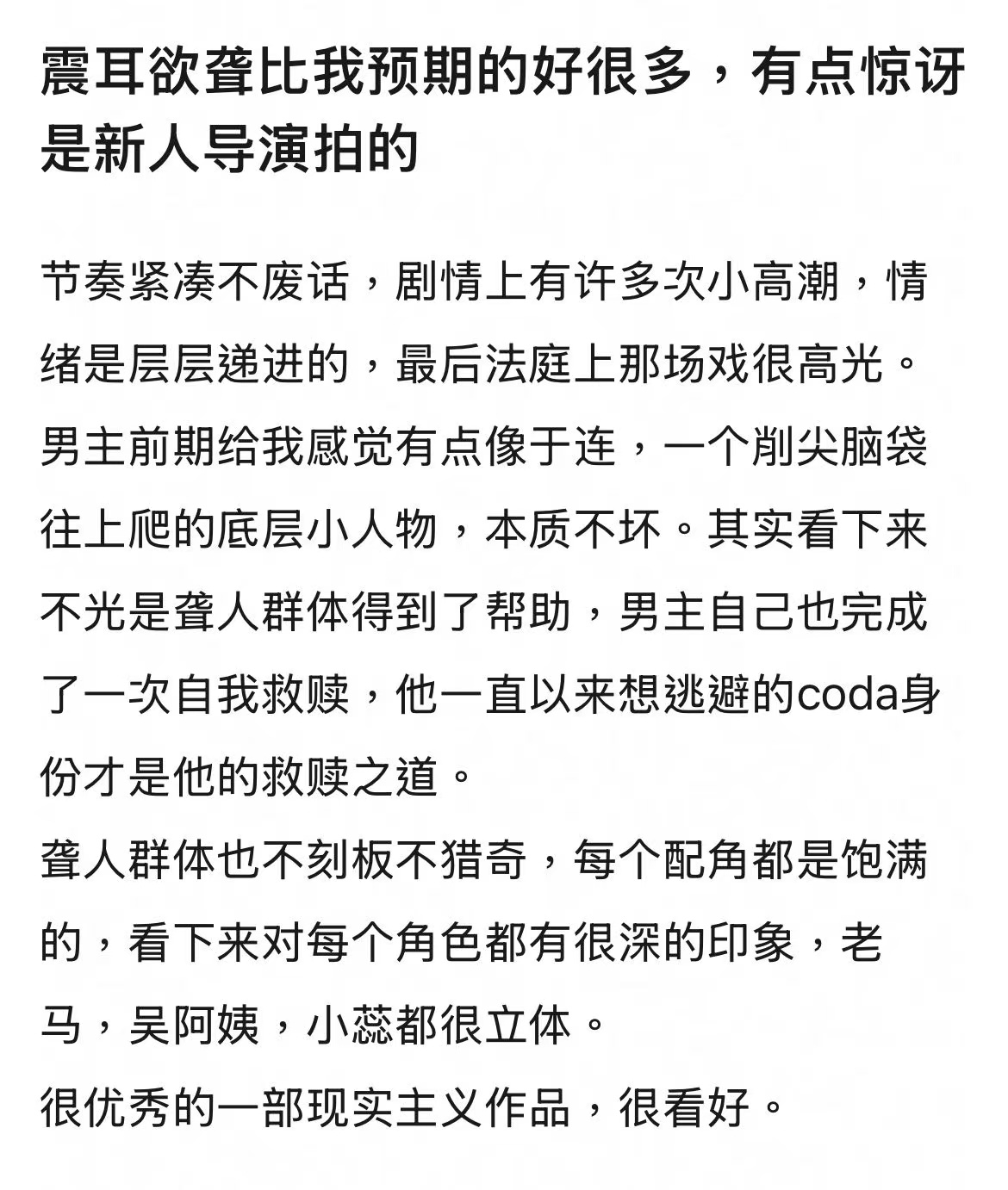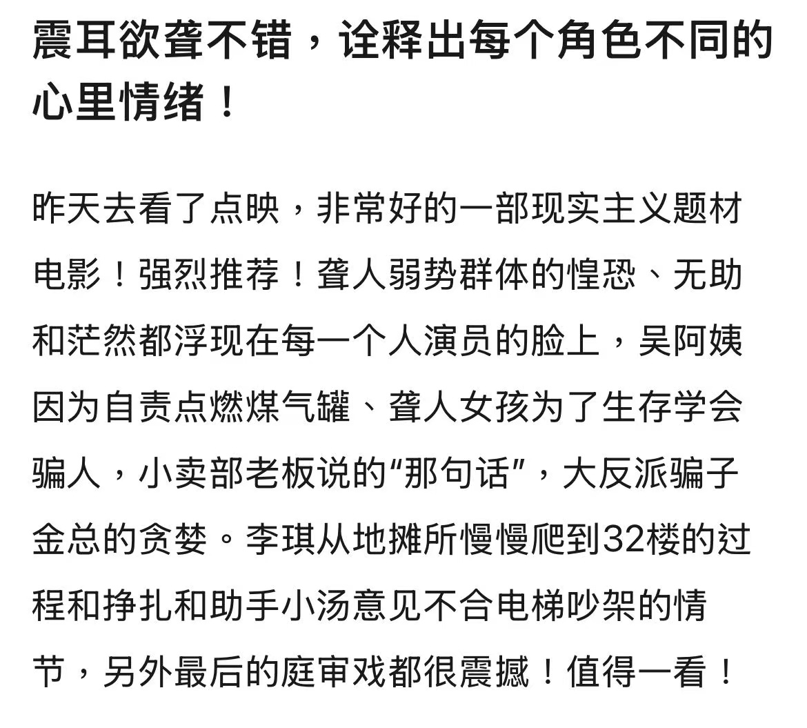 震耳欲聋国庆档点映票房逆跌震耳欲聋点映票房逆跌 《震耳欲聋》点映第二日直接逆跌,单日票房突破1680万,场均人次从15.3跃升至17.6。影片直面听障群体的维权困境,真实刻画令人动容,檀健次将律师在名利与良知间的挣扎演绎得层次分明,期待明日再创新高!