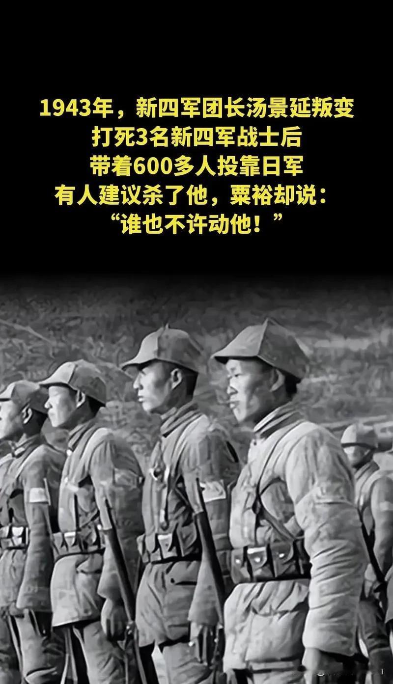 1943年,新四军团长汤景延叛变,打死3名新四军战士后,带着600多人投靠日军,有人建议杀了他,粟裕却说:“谁也不许动他!” 这话传到新四军总部,整个营区都炸了。老兵们红着眼眶拍桌子,年轻战士攥着枪杆骂叛徒,谁都没法接受这个事实——汤景延不是新兵蛋子,他是抗战爆发就拉起队伍抗日的老骨干。 1940年带着游击总队投奔新四军,一手把通海自卫团练得能打硬仗,老百姓都喊他们“汤团”。这样的人怎么会叛变?更别提还“打死3名战友”,这简直是往所有人心口捅刀子。 只有粟裕端坐在地图前,指尖划过苏中地区的标注,眉头都没皱一下。 他知道,那3个人根本不是新四军战士,是汤景延按计划“清理”的汉奸——当时日军正纠集1.6万兵力搞“清乡”,铁桶似的围着苏中根据地,还派特务姜颂平盯着汤团,想从内部瓦解抗日力量。 汤景延接到姜颂平的诱降信,第一时间就秘密跑回总部,和粟裕敲定了一个险到极点的计划:假投降,打入敌人心脏,再里应外合“破腹而出”。 那3个汉奸是反特组织刚抓到的,私通日军传递情报,早就该处理。汤景延借着“谈判破裂”的由头,在驻地故意演了场“火并”,当场枪毙这三人,尸体扔在路边给日军探子看。 这出戏演得太真,连新四军内部都有大半人信了,更别说满心算计的日军。姜颂平亲眼看到“叛变现场”,连夜上报说“汤景延是真心归顺”,日军当即答应保留汤团建制,还让他们原地驻防。 4月15日,汤景延带着634名战士走进日军营地,连家小都一起接了过来。有人在队伍里偷偷抹眼泪,不是怕当“伪军”,是怕被老乡戳脊梁骨。 汤景延走在最前面,军装领口扣得死死的,路过日军岗哨时眼神都没斜一下,可没人知道,他兜里揣着两部电台的零件,夜里要偷偷组装起来发情报。 日军的疑心重得很,把汤团调去南通训练,还故意安排在远离港口的地方。 汤景延心里门清,这是在防着他们和根据地联系。他索性顺着敌人的心思来,找到姜颂平说要开商行“捞点好处”,贪财的姜颂平立马点头入伙。 商行成了秘密联络点,汤景延借着进货出货的名义,把日军的“清乡”部署、兵力调动全传了出去,还悄悄运出成箱的药品和弹药,送回新四军驻地。 为了装得更像叛徒,汤景延硬着头皮去青楼、烟馆应酬,每次回来都把军装洗了又洗。有次日军突然把他押到郊外,命令他“向前走”,身后枪声一响,子弹擦着耳朵飞过——这是敌人的忠诚测试。 他硬生生站住没回头,直到日军笑着说“汤团长果然可靠”,才发现后背的衣服早被冷汗浸透。回到营地,他对着战友们的眼睛,一句话没说,只是敬了个军礼,所有人都懂,这敬的是忍辱负重的彼此。 日子一天天熬着,汤团在敌人眼皮底下潜伏了163天。9月份局势突变,日军“清乡”惨败,伪省长李士群在内斗中被毒死,汤团随时可能被清算。粟裕掐准时机,密电汤景延:29日夜行动。 汤景延立刻放出消息,说部下周显才要结婚,请日伪大小头目赴宴。敌人们揣着红包赶来,酒喝到正酣,汤景延突然摔碎酒杯,藏在门后的战士瞬间冲出来,黑洞洞的枪口抵住了他们的太阳穴。 与此同时,分散在各处的汤团战士同时暴动,一夜之间摧毁十多个据点,伏击了日军“清乡观战团”,60多个敌酋被全歼。 等接应的新四军第三旅赶到时,汤景延正站在路口清点人数,634人一个不少,连枪都没丢一支。 粟裕快步走上前,握住他满是老茧的手,只说了一句“委屈你了”,汤景延憋了半年的眼泪终于掉了下来,却笑着摇头说“值了”。 后来有人问粟裕,就不怕汤团真的叛变?粟裕指着墙上的地图说,汤景延敢把家小都带进敌营,敢用生命演忠诚测试,这样的人心里装着家国,怎么会真叛变。 这场“假投降”不仅粉碎了日军的“清乡”计划,更让所有人看清,真正的英雄从不是站在光里喊口号的人,是敢钻进黑暗、扛着骂名也要救国的人。 1948年,汤景延在浙东抗击国民党时被俘,面对严刑拷打始终没吐露半个字,最后在上海江湾刑场英勇就义。他用一生证明,所谓忠诚,从来不是永远站在明处,而是在任何黑暗里都守得住初心。 各位读者你们怎么看?欢迎在评论区讨论。