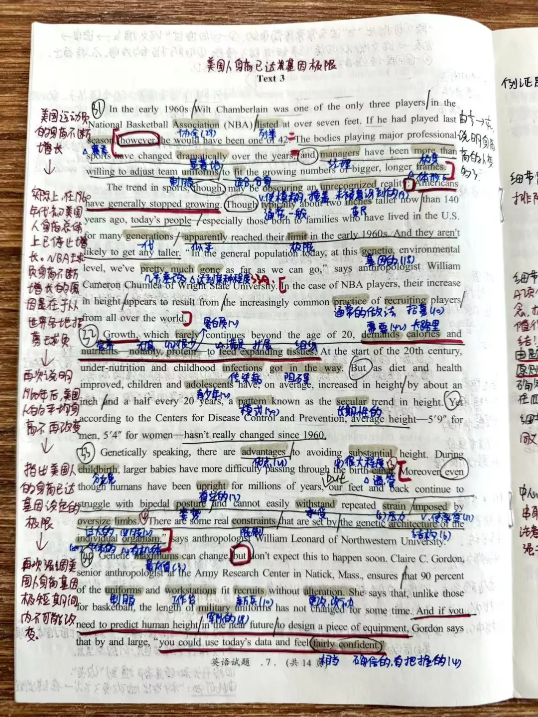 通过串联文章可以发展文章讨论的核心是“美国人的身高达到限制”,故AB选项中的“人类的身高”属于扩大范围。