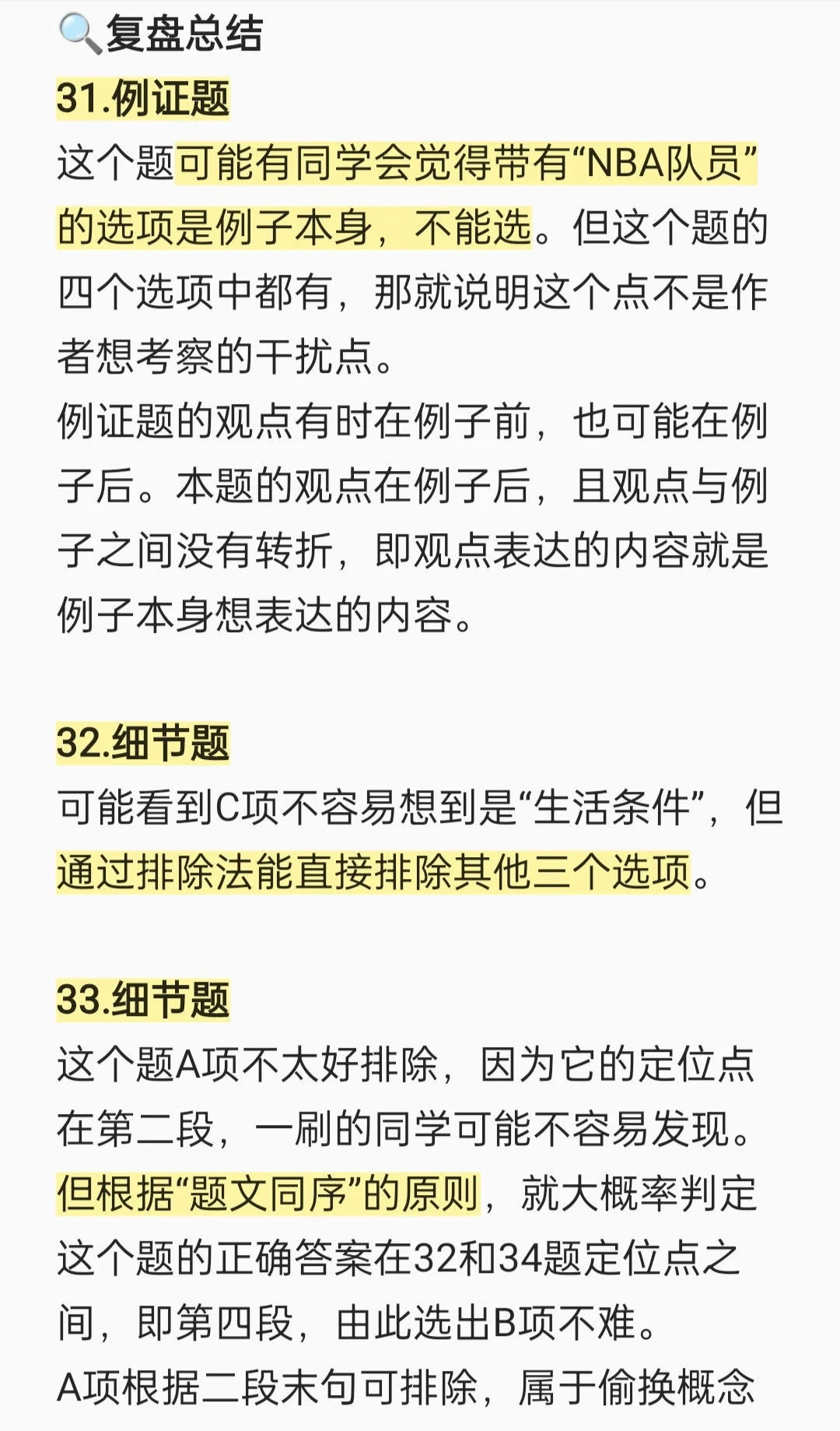这个题可能有同学会觉得带有“NBA队员”的选项是例子本身,不能选。但这个题的四个选项中都有,那就说明这个点不是作者想考察的干扰点。