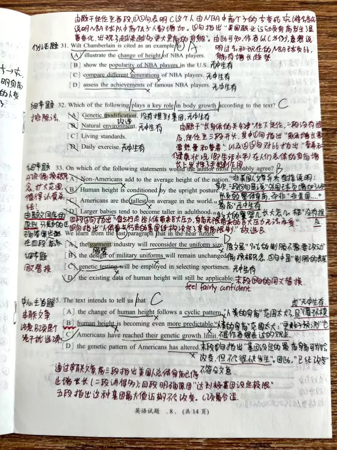 这个题A项不太好排除,因为它的定位点在第二段,一刷的同学可能不容易发现。但根据“题文同序”的原则,就大概率判定这个题的正确答案在32和34题定位点之间,即第四段,由此选出B项不难。