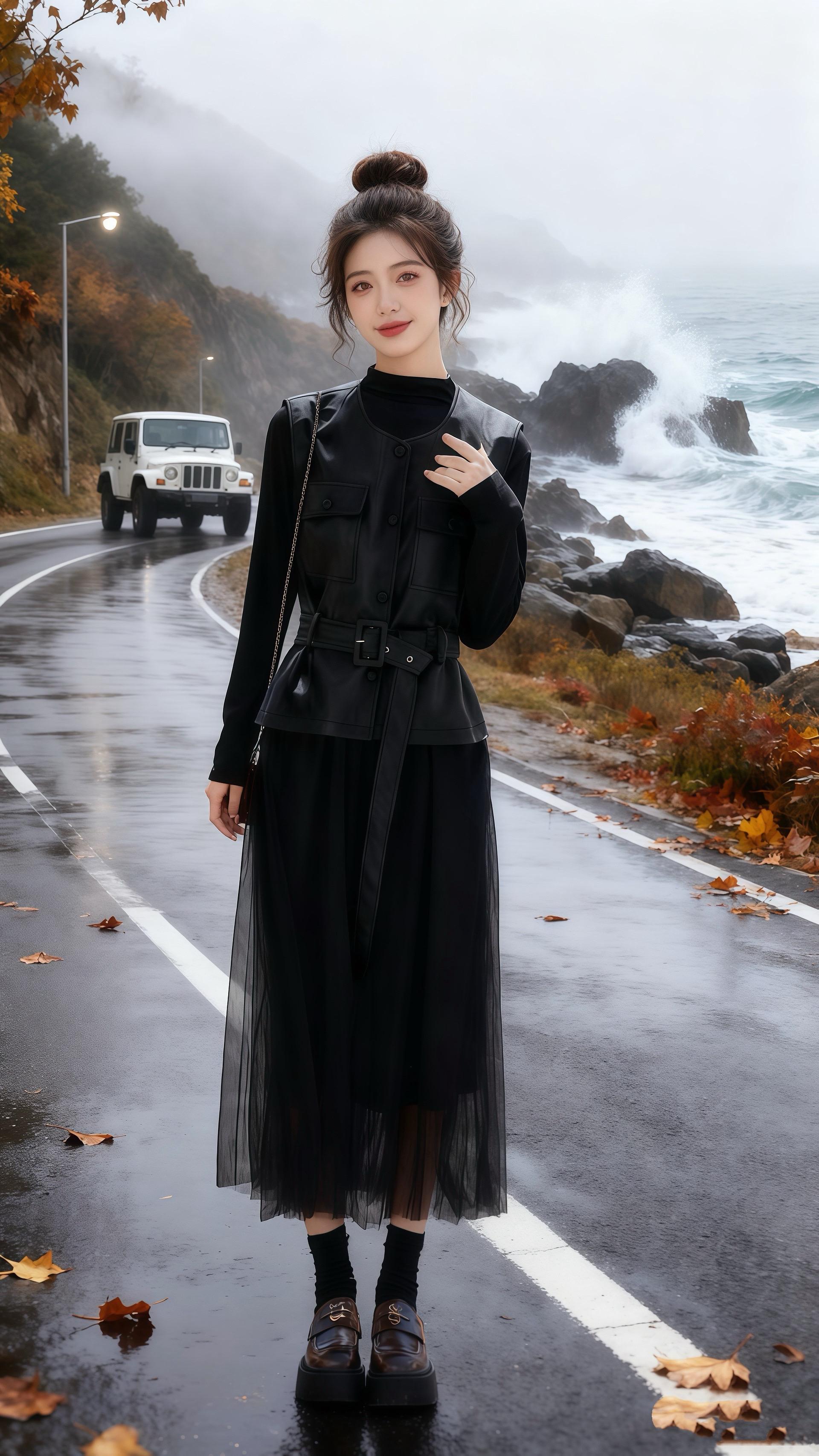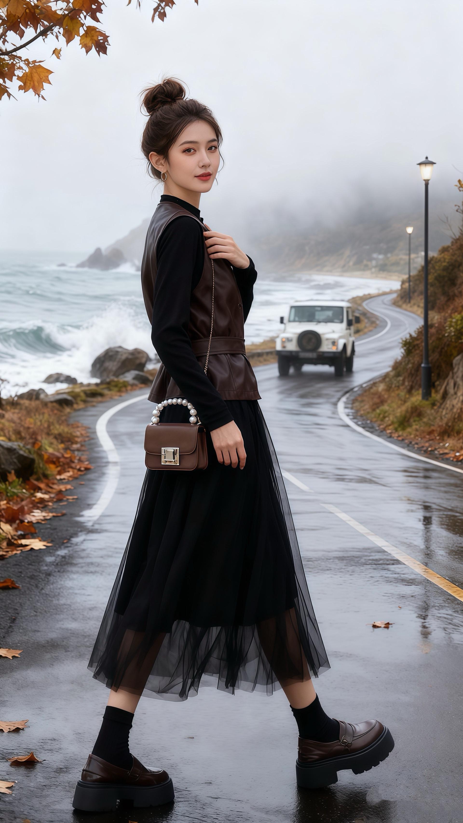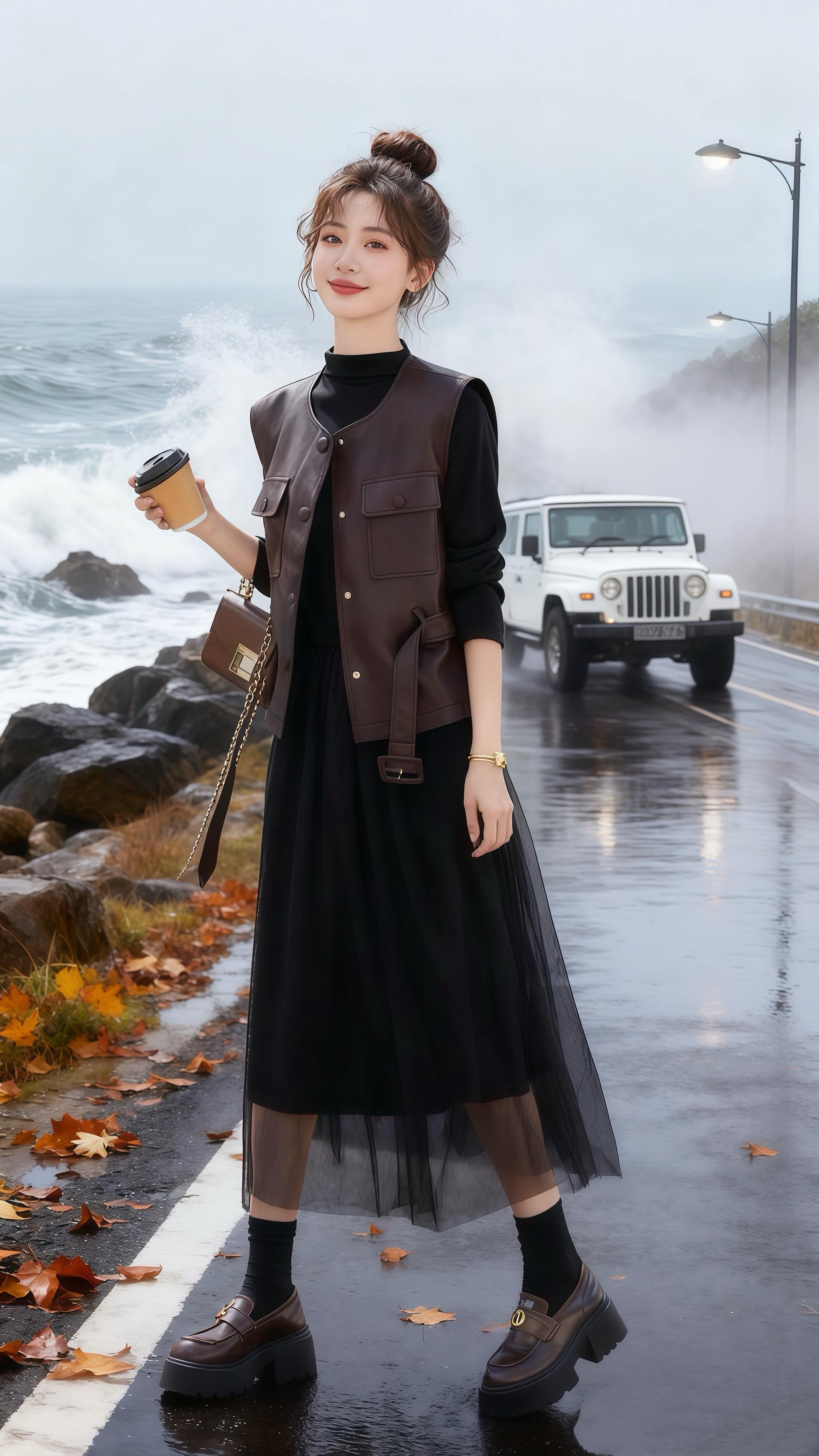 车窗外,海岸线被雾线切成两段。她忽然看见路肩站着个人,棕色皮革马甲在灰调里像块暖色礁石。他手里的咖啡杯冒出白气,像雾里开出的一朵小太阳。
