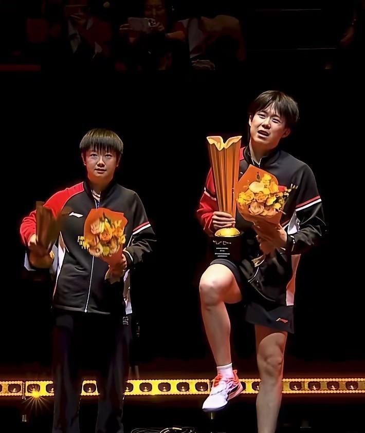 王楚钦这表情,任何演员都表演不出来的。 这奖杯有多重?楚钦呲牙咧嘴的表情和抬腿托