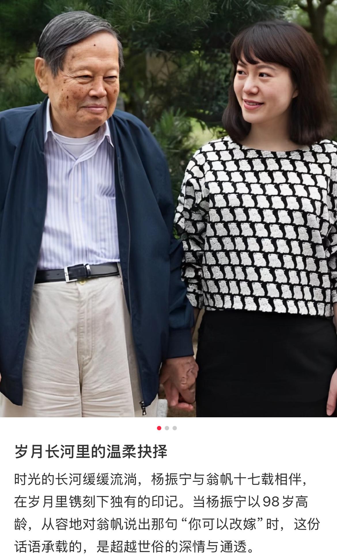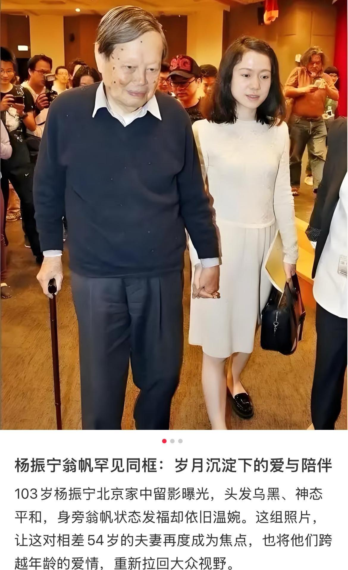 总让人觉得哪里“反常”—— 杨振宁已经 103 周岁, 瘫痪、白发、失智、耳背…… 这些高龄“标配”他愣是一条没中。 “103岁杨振宁活成‘反常体’!发量黑密能遛弯,翁帆的陪伴藏着长寿密码?”103岁的杨振宁最近又刷屏了——别人这个岁数早瘫了聋了,他却能自己遛弯写毛笔字,头发还黑多白少,说七十都有人信!这哪是“老”了?分明是“逆生长”! 有人夸他先天底子硬,但更该夸翁帆——她把“高质量陪伴”玩明白了:饮食作息管得严,情绪价值给得足,医疗团队配得全,老先生每天乐呵呵,寿命自然“开挂”。 更妙的是,这段婚姻是双向滋养:49岁的翁帆眼角带笑,苹果肌饱满,活得比29岁还松弛,哪有什么“苦大仇深”? 那些总问“翁帆图啥”的人该醒醒了——她脸上的光,早把答案写明白了:好的婚姻从不是单方面付出,而是互相成就。 你觉得“高质量陪伴”是长寿秘诀,还是双向奔赴的感情才最养人?评论区聊聊,说不定能偷师到幸福密码!