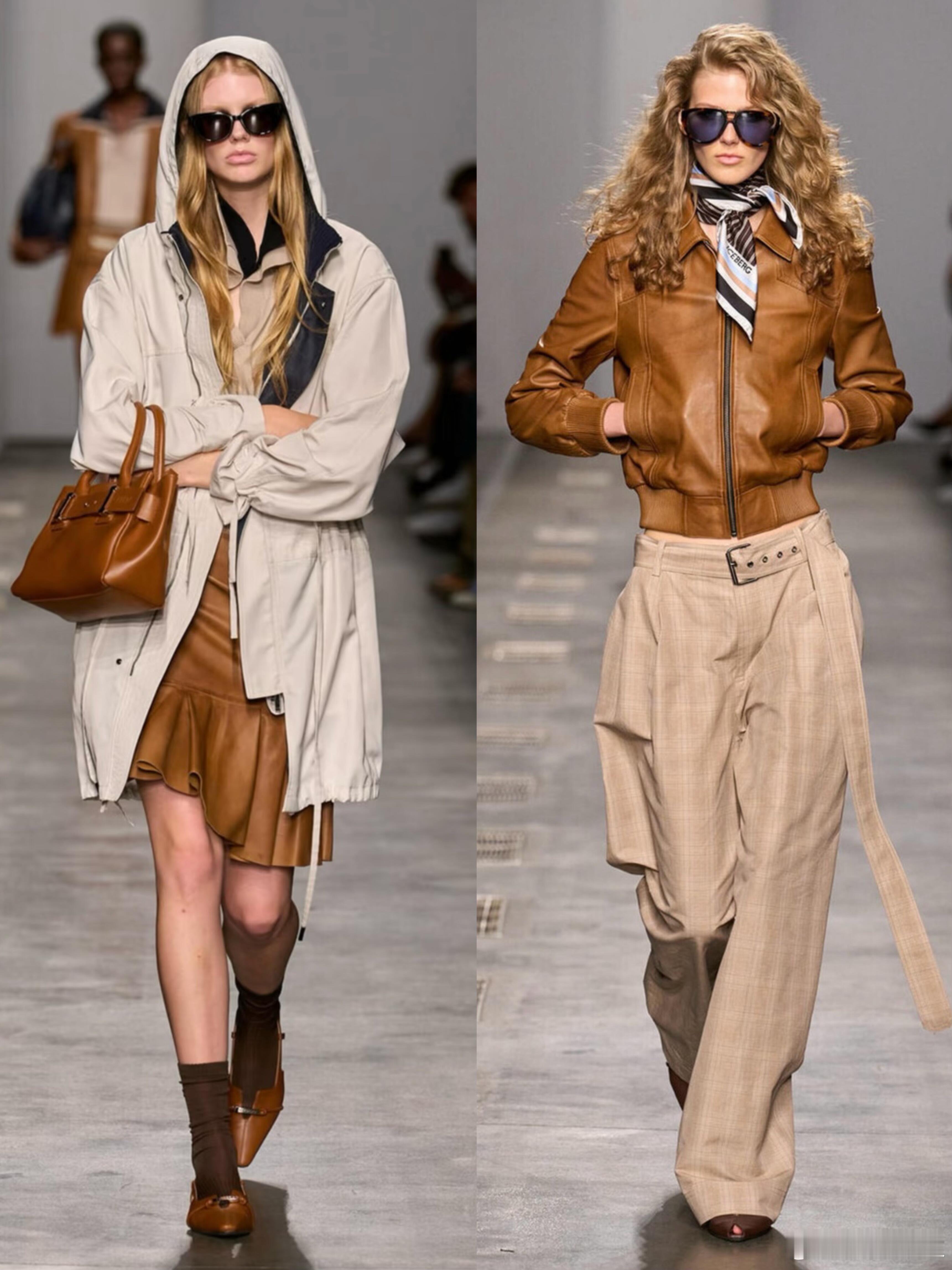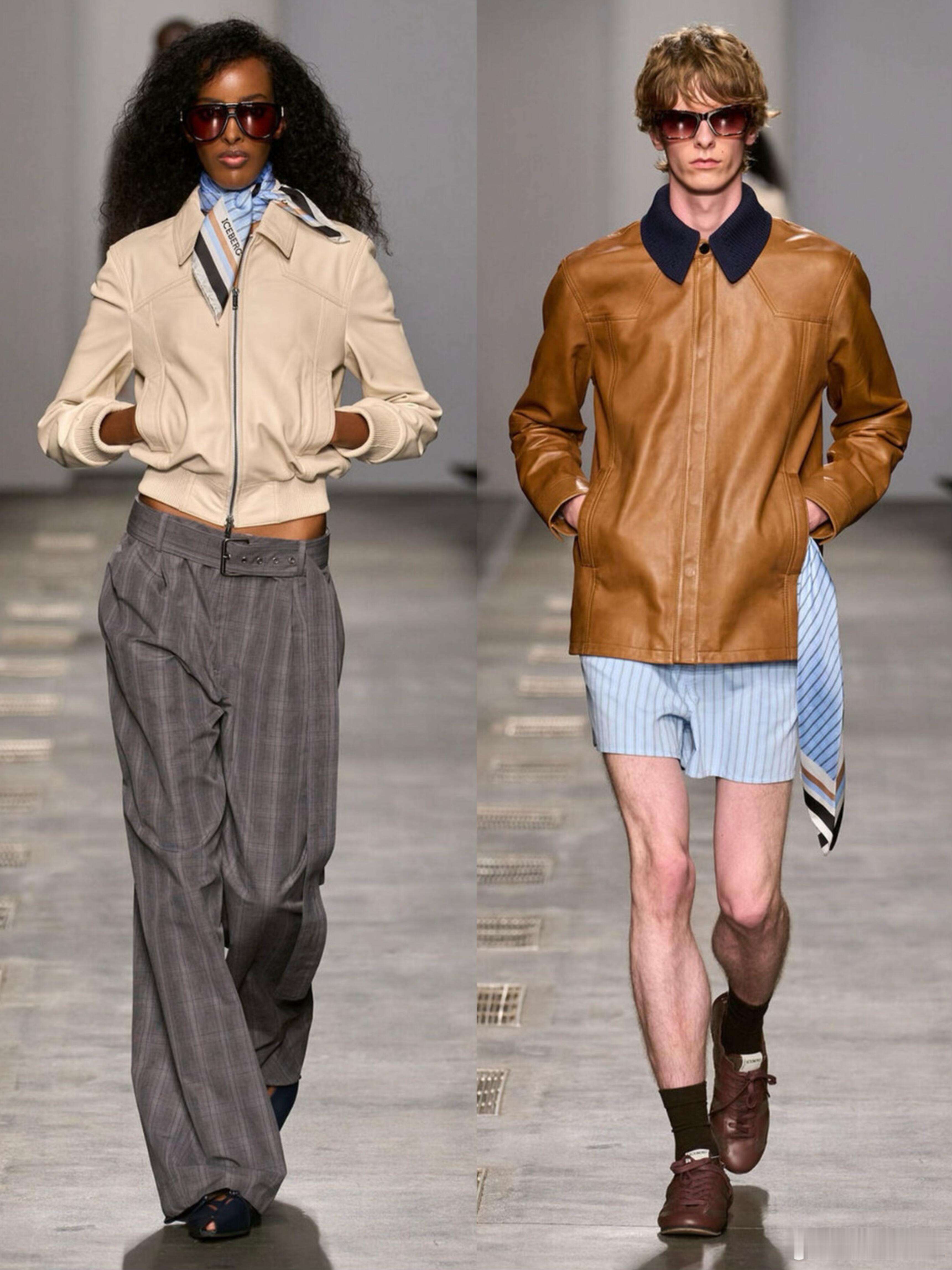 James Long 在设计中巧妙融合了 90 年代的复古元素与现代时尚理念。90 年代复古派克大衣,带着浓浓的怀旧气息,宽大的版型、厚实的面料,仿佛是那个时代街头青年的标志性装扮。而精裁皮革套装则展现出摩登的都市感,利落的剪裁、光滑的皮革质感,彰显着精致与干练。棕、灰的克制色调运用,更是为整个系列增添了一份沉稳与内敛,既怀旧又摩登,在时光的流转中找到了完美的平衡点。