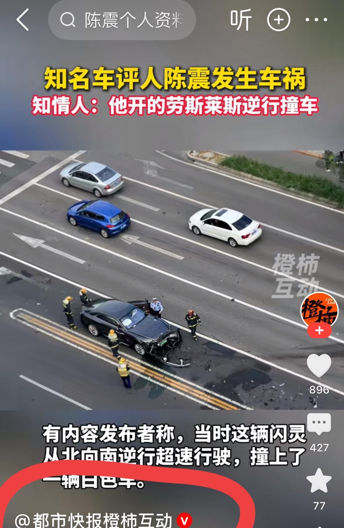现在一些官方媒体也是非常不负责任,陈震是发生交通事故了,人家交警回应正在处理中。到某些媒体里就成了陈震逆行撞车呢?事故后车停在逆行车道上,不代表车就是逆行,可能是潮汐车道,可能是撞击后产生的位移等等。还说人家超速,有证据吗,去现场测速了吗?一些媒体就是埋单不闲事大,巴不得名人出事。