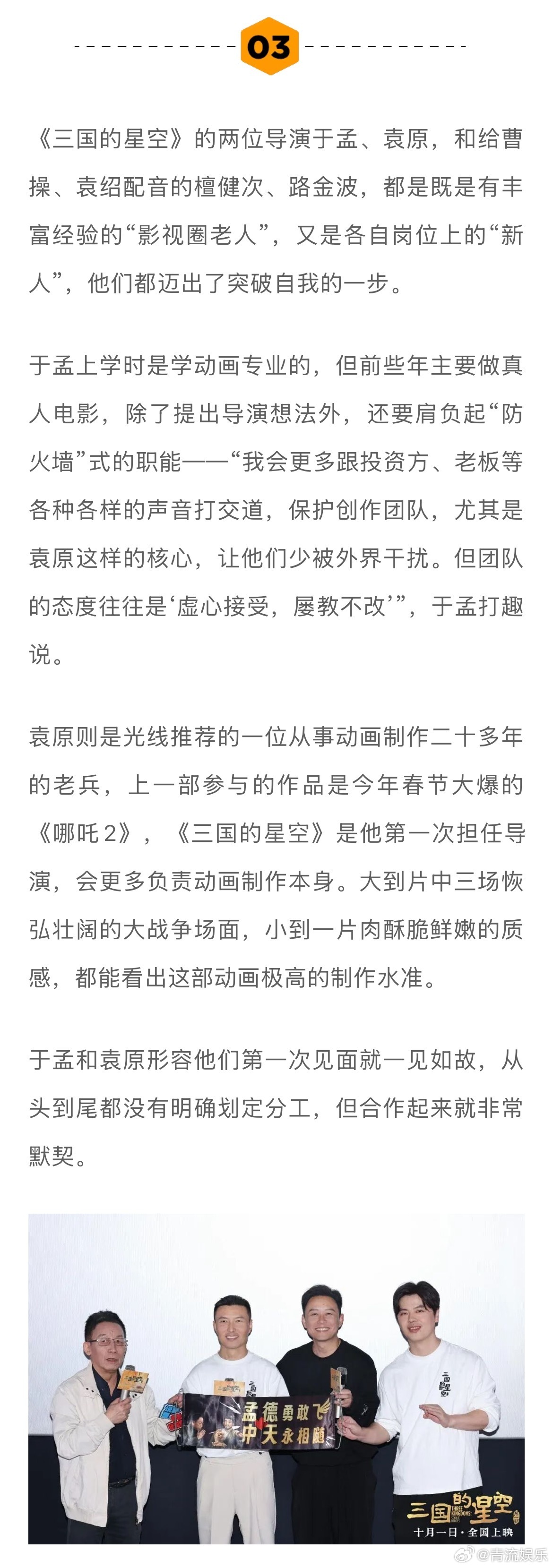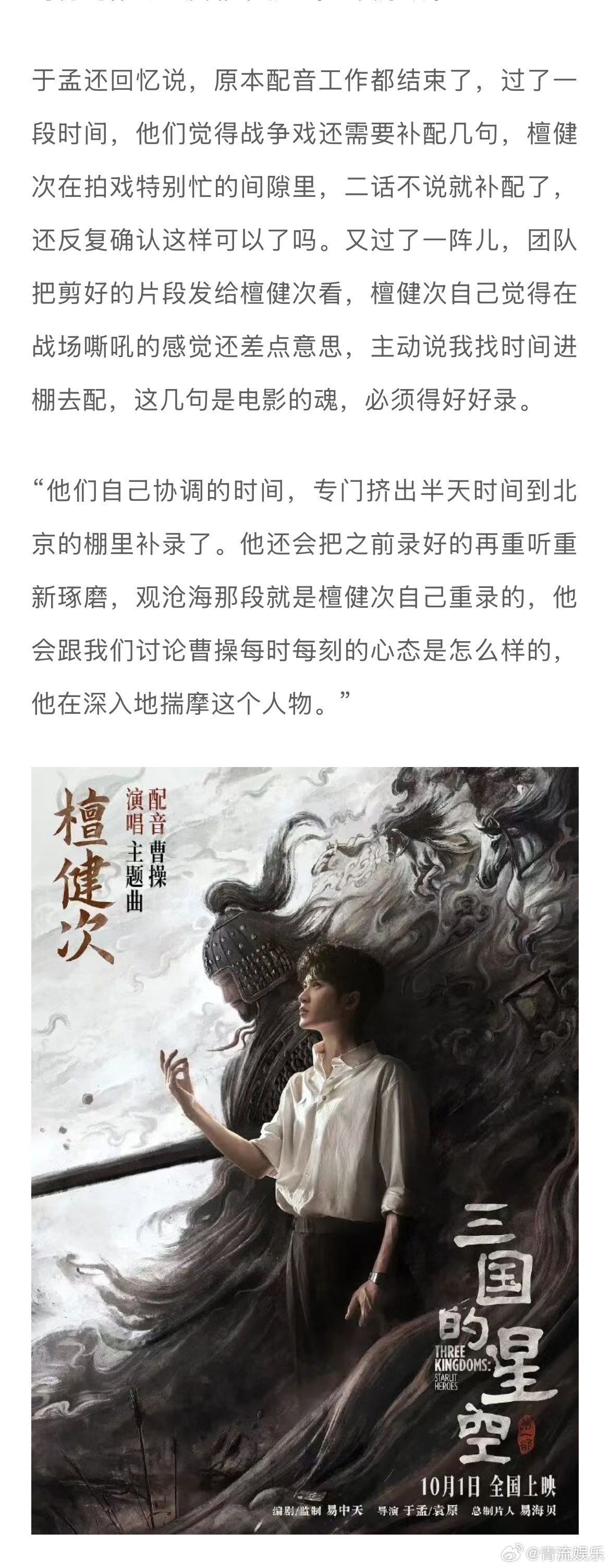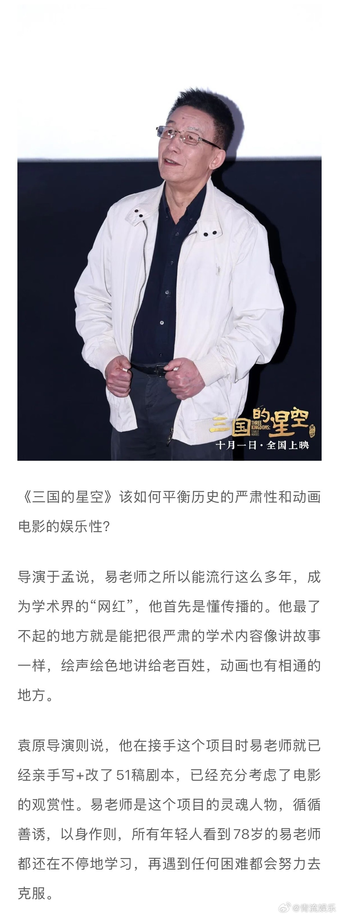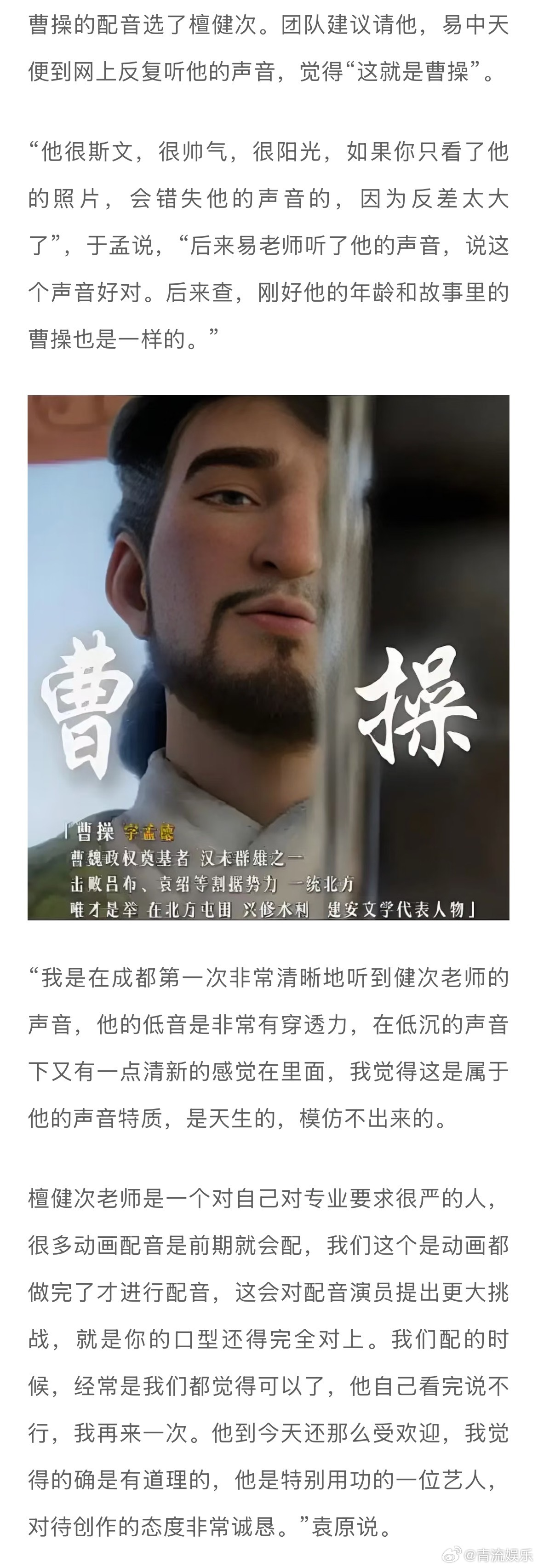 易中天说檀健次的声音就是曹操78岁易中天回应为何想做动画三国 据导演于孟回忆,78岁的易老师精力和敬业程度惊人,51稿剧本的打磨过程中,他通常一两天就能交出一版新稿,有大篇幅改动也不会超过一周。易老师的态度也非常严谨,每个标点符号的使用都以出版物级别要求自己,在后期制作和配音的过程中,易老师也不允许随意改动台词。