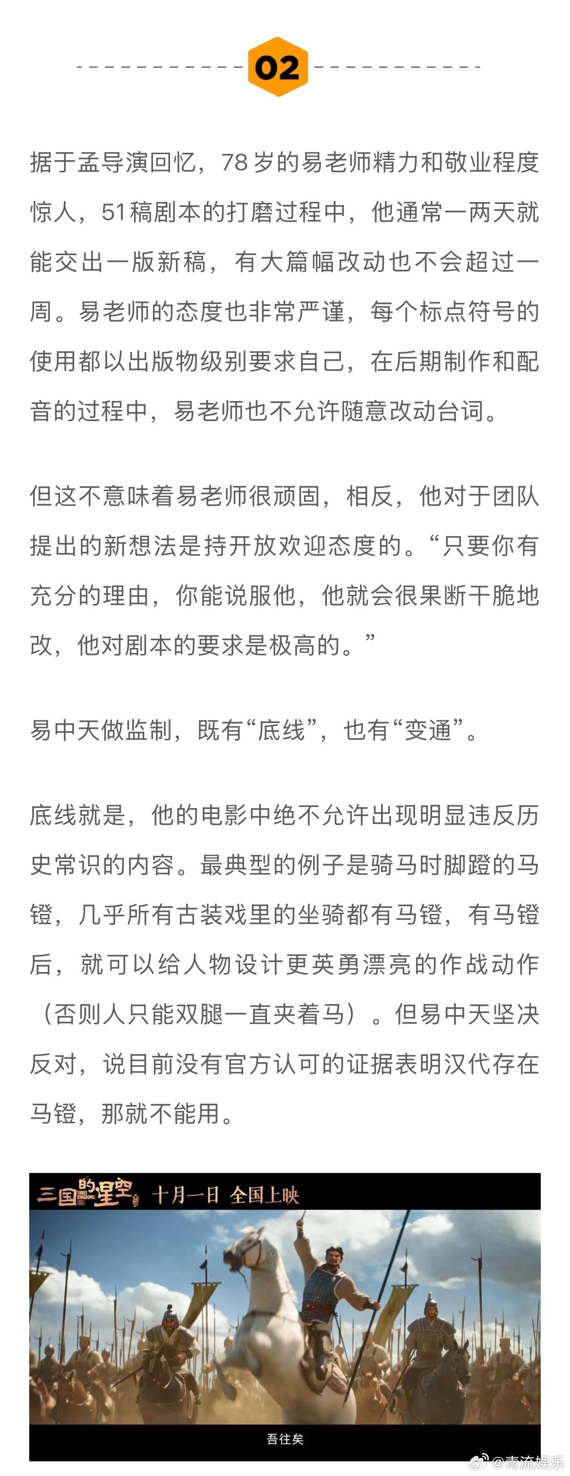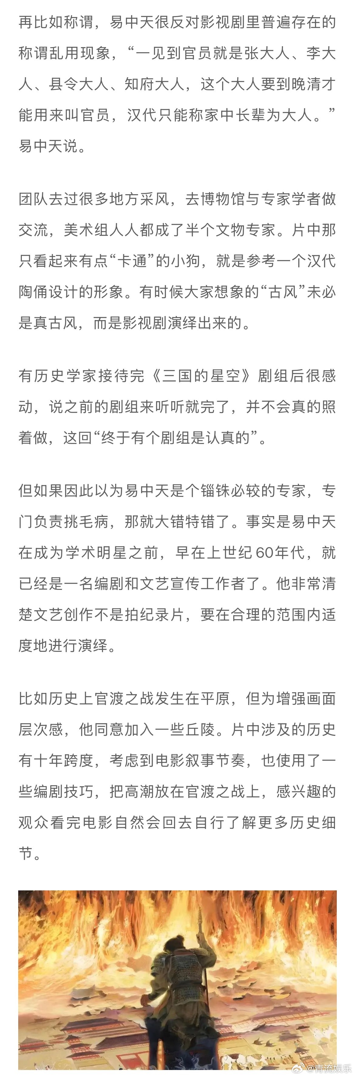 但这不意味着易老师很顽固,相反,他对于团队提出的新想法是持开放欢迎态度的。“只要你有充分的理由,你能说服他,他就会很果断干脆地改,他对剧本的要求是极高的。”比如在称谓方面,易中天很反对影视剧里普遍存在的称谓乱用现象,“一见到官员就是张大人、李大人、县令大人、知府大人,这个大人要到晚清才能用来叫官员,汉代只能称家中长辈为大人。”