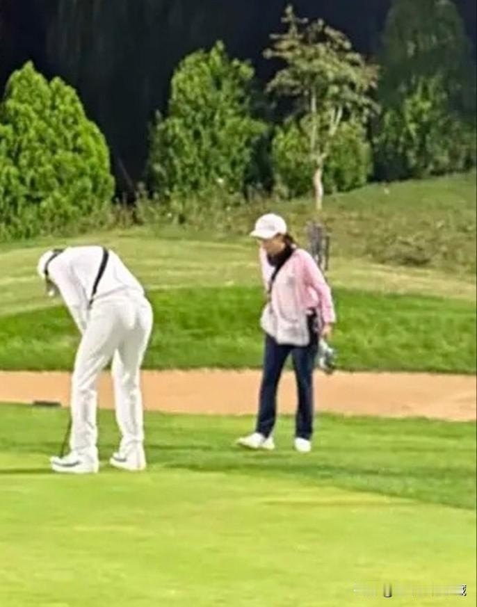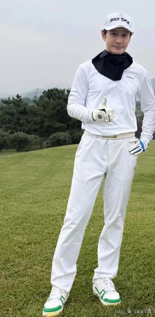 一身白色高尔夫球装的教主黄晓明真的光鲜帅气,头戴棒球帽,紧身白色棒球服显得他皮肤