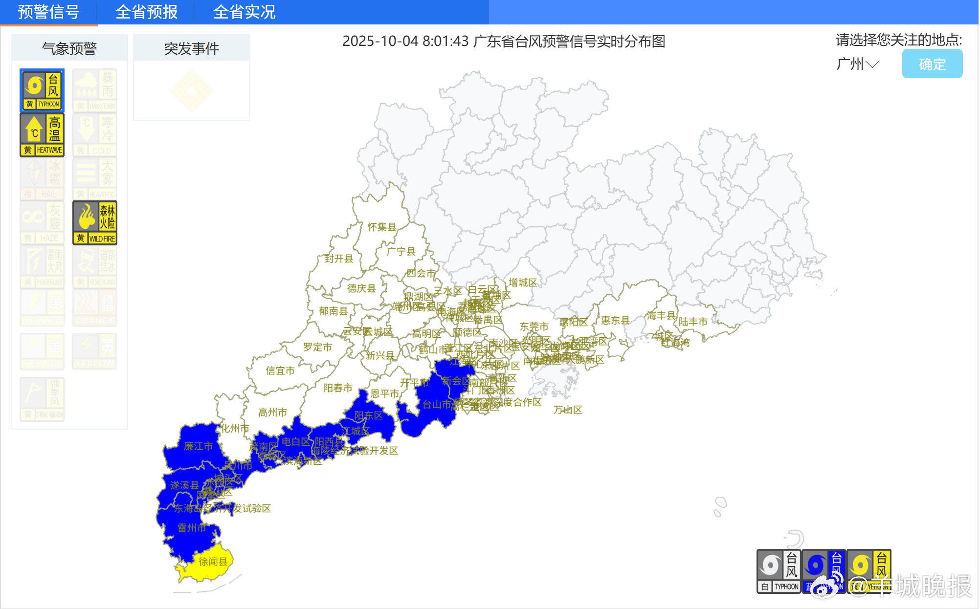 截至10月4日8时,广东徐闻维持发布台风黄色预警信号,湛江其他区域维持发布台风蓝色预警信号;茂名、阳江、江门等地,有市县区发布台风蓝色预警信号;云浮、肇庆、佛山、中山、珠海、广州、东莞、深圳、惠州、汕尾等地,有市县区发布台风白色预警信号。