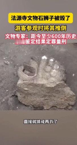 “好奇心害死猫!”3月11日北京法源寺,一名游客在参观时,突然上前用手摸起了寺前的小石狮子,不料这位游客一用力,石狮子直接侧翻摔在了地上,碎成了两半,这个至少有六百年的古文物如此轻易的被破坏,重罪重判恐怕是难逃了!网友:“我还没去看过,就这么毁了?”[无辜笑] 事发时一名游客伸手触摸石狮,石狮随即从底座翻落,当场碎裂成两半。 这尊石狮子已有六百多年历史,属于明代文物,现场目击者说,那名游客伸手抚摸石狮后,石狮突然失去平衡,整个从底座上翻了下来,摔在地上直接断成了两截。 事发后寺内工作人员立即封锁了现场区域,并第一时间联系了文物保护部门,碎裂的石狮残块被妥善保护起来,等待专业人员评估修复可能性。 文旅部门和公安机关已经介入调查,那名游客目前正在配合相关部门的调查工作,根据文物保护法的相关规定,损毁文物的行为可能面临法律责任。 法源寺始建于唐代,是北京城内现存历史最悠久的古刹之一,这对石狮子一直立在寺前,经历了数百年的风吹日晒,文物专家表示,明代石狮的雕刻工艺和艺术价值都很高,这次损毁造成的损失难以估量。 这些文物一旦损坏,往往无法完全恢复原貌,即使通过修复技术拼接,文物本身的历史完整性也已经被破坏,石质文物尤其脆弱,表面风化严重的石雕,轻微的外力就可能造成断裂。 法源寺这次事件发生得很突然,按照寺内平时的管理,石狮周围并没有明显的隔离措施,游客可以近距离观看,但文物保护的相关规定明确要求,游客不得触摸文物。 目前文物部门正在组织专家对损毁的石狮进行评估,初步判断,石狮从中间断裂,断面比较整齐,这为后续修复提供了一定可能性,但即便能够拼接,修复痕迹也会永久存在。 网友们议论纷纷: “看着真心疼!六百年的宝贝,多少战乱天灾都没事,结果被一伸手整没了,这必须得严惩啊!” “手咋这么欠呢?管不住自己就别出门逛古迹,建议列入旅游黑名单,全国景区都拉黑!” “说是好奇,其实就是没素质。别说文物了,我家小区石墩子都不敢这么乱摸……” “支持重判!不然以后谁都敢上手摸,老祖宗的东西经不起这么糟蹋。” “法源寺我去年去过,那石狮子特别精致,现在孩子再也看不到了,真的太可惜了……” “罚款+坐牢+赔偿修复费用,一个都不能少!文物修复可不是简单胶水粘一下的事。” “能不能也追责一下管理方?文物保护是不是也该加强防护?光立个牌子真不够啊……” 除了惩罚游客,景区是否也应该提升保护措施? 官方信源:国家文物局官方网站