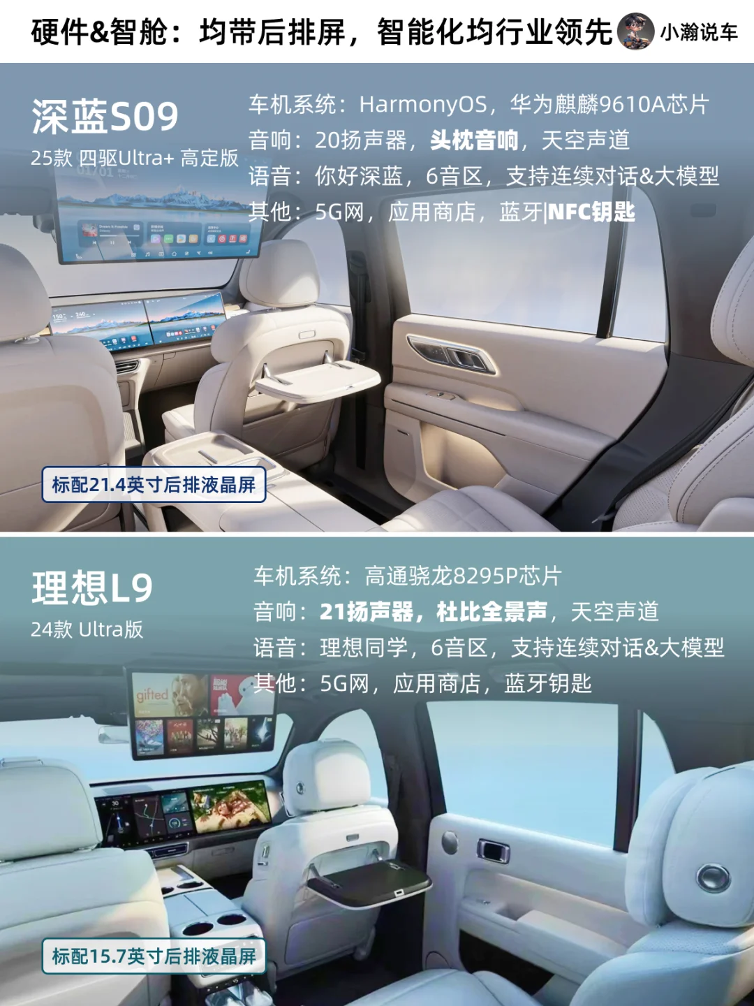 🚗当然,作为长安旗下新能源品牌销量担当,深蓝这次给出的产品确实是一款可以硬刚理想老9的车型:除了3排6座超大车内空间和上面提到的“彩电冰箱大沙发”外,还标配了HarmonySpace鸿蒙座舱和华为乾崑智驾ADS!