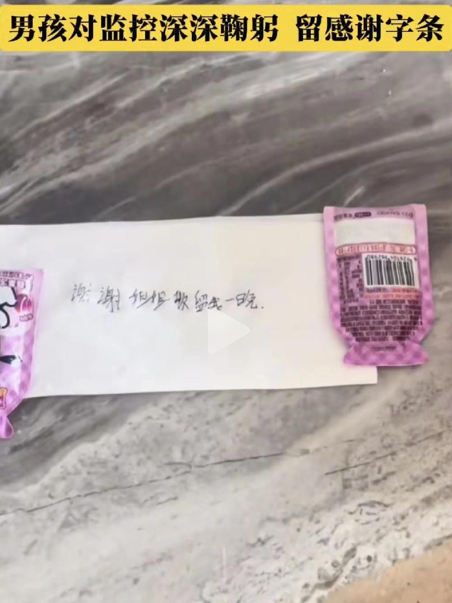 湖南怀化,一男孩与好朋友相约一起玩,结果因朋友中途被父母接走,男孩凌晨独自滞留外地无处落脚,便向一酒店老板娘求助。后老板娘好心让其留宿大厅后,感恩的男孩又是为其送零食,又是对监控深深鞠躬答谢,还留感谢字条的举动,让老板娘感动泪目了! 原来,男孩是从外地来找朋友玩的,可他们还没玩多久,男孩朋友中途就被其家长带回家了,留得男孩一人孤独无助的在一酒店外徘徊了许久。后男孩鼓起勇气进了酒店,但没钱住店的他就向老板娘说明了情况,希望老板娘能收留他一晚。 而老板娘得知情况后,也是收留了男孩,并让其在大厅里过夜。期间男孩去洗漱时,老板娘怕男孩被蚊子咬,便特意拿出一盘蚊香给男孩点上,后又怕男孩睡着热,又贴心的给男孩拿来了一个电风扇,做完这一切后,老板娘才放心的回屋休息了。 本以为事情就此结束了,不料男孩洗漱完回来时,见老板娘也回屋休息了,便悄悄的从自己包拿出几包零食放在柜台上,后又对着镜头感激的鞠躬答谢老板娘,并留下一张纸条写道“谢谢姐姐收留了我一晚”后才去沙发上睡觉了。 第二天早上,当老板娘回到前台时,发现男孩已经走了,但当其看到前台的零食和纸条时,再回看了监控里男孩对其鞠躬答谢的行为后,老板娘被孩子讲礼貌又感恩的行为给感动落泪了。 对此老板娘表示,本就是举手之劳的事,男孩却那么的懂礼貌有良心,特别是孩子深深的鞠上一躬时,老板娘更是被暖到了内心深处。试想一下,如果他朋友的家长能带他一起回家住一晚该多好… 不得不说,老板娘不但心好,对待男孩时更是细心和贴心,也正是老板娘的善良,让男孩在孤立无助之时得到了帮助和暖意。而男孩也很棒,面对老板娘的善意时,他不但懂礼貌更是懂感恩,从他的一举一动来看,生活中的他也一定个善良的孩子。看来每每善良遇到感恩之时,总会碰撞出不一样的火花!为这两个善良之人点赞! 但反观男孩朋友的家长就太不靠谱,十多岁的孩子从外地来找你的孩子玩,将心比心都是为人父母,至少你也打个电话跟对方的父母沟通好,把孩子安置好了再走吧,让人家一个人留在陌生的地方,这要是真出点啥事情咋办?这朋友家长确实应该反思反思了。
