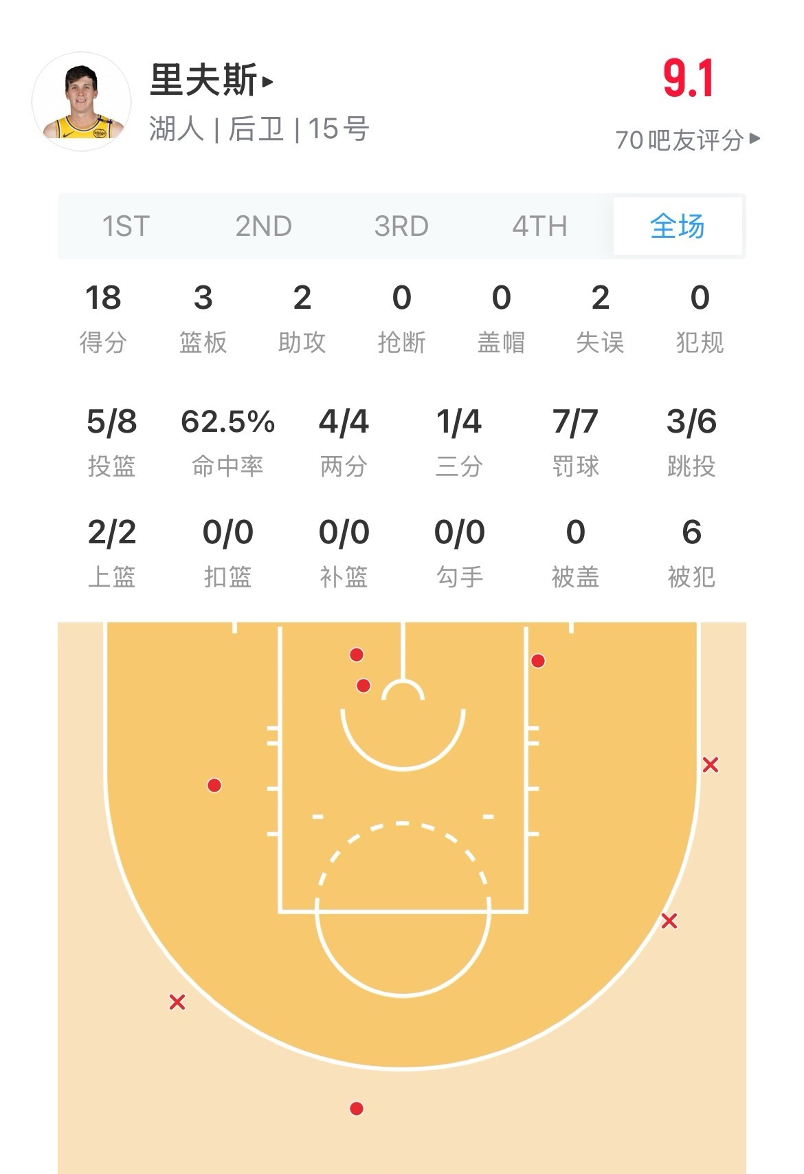 半场表现最佳:里夫斯,得到18分3篮板2助攻,投篮8中5,62.5%命中率,三分