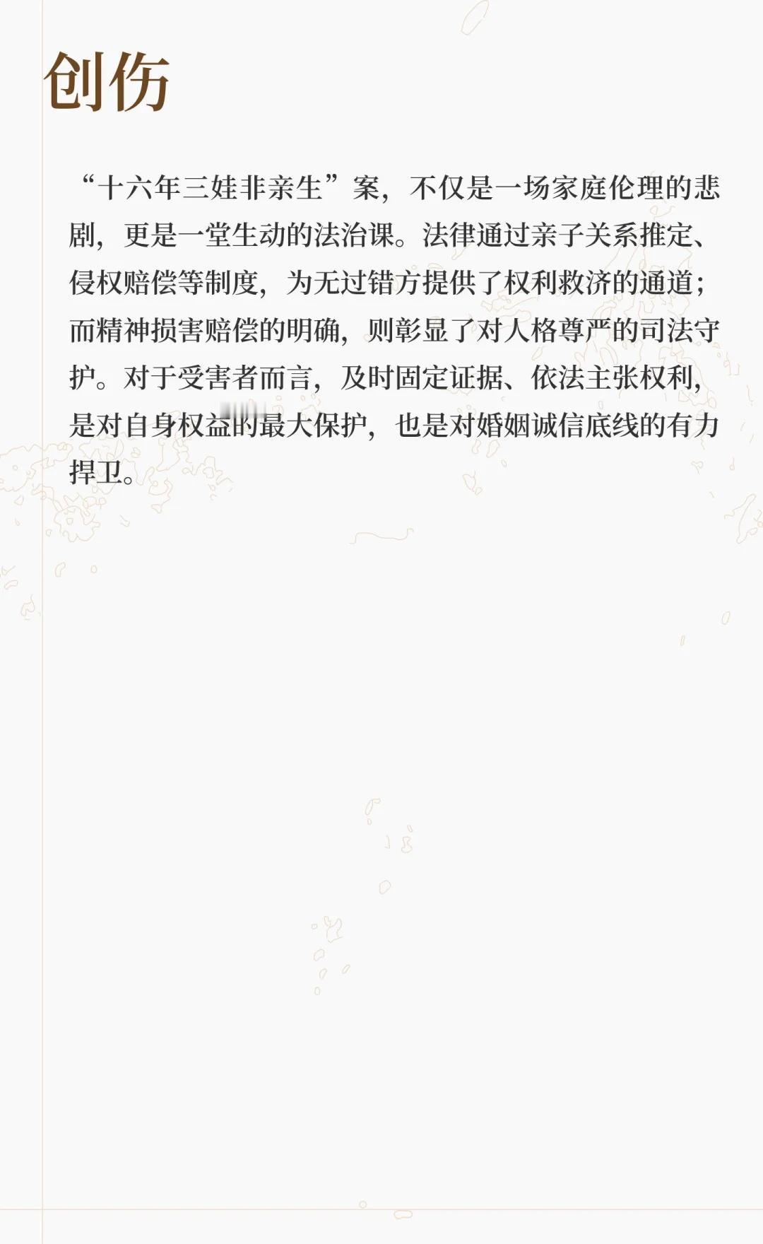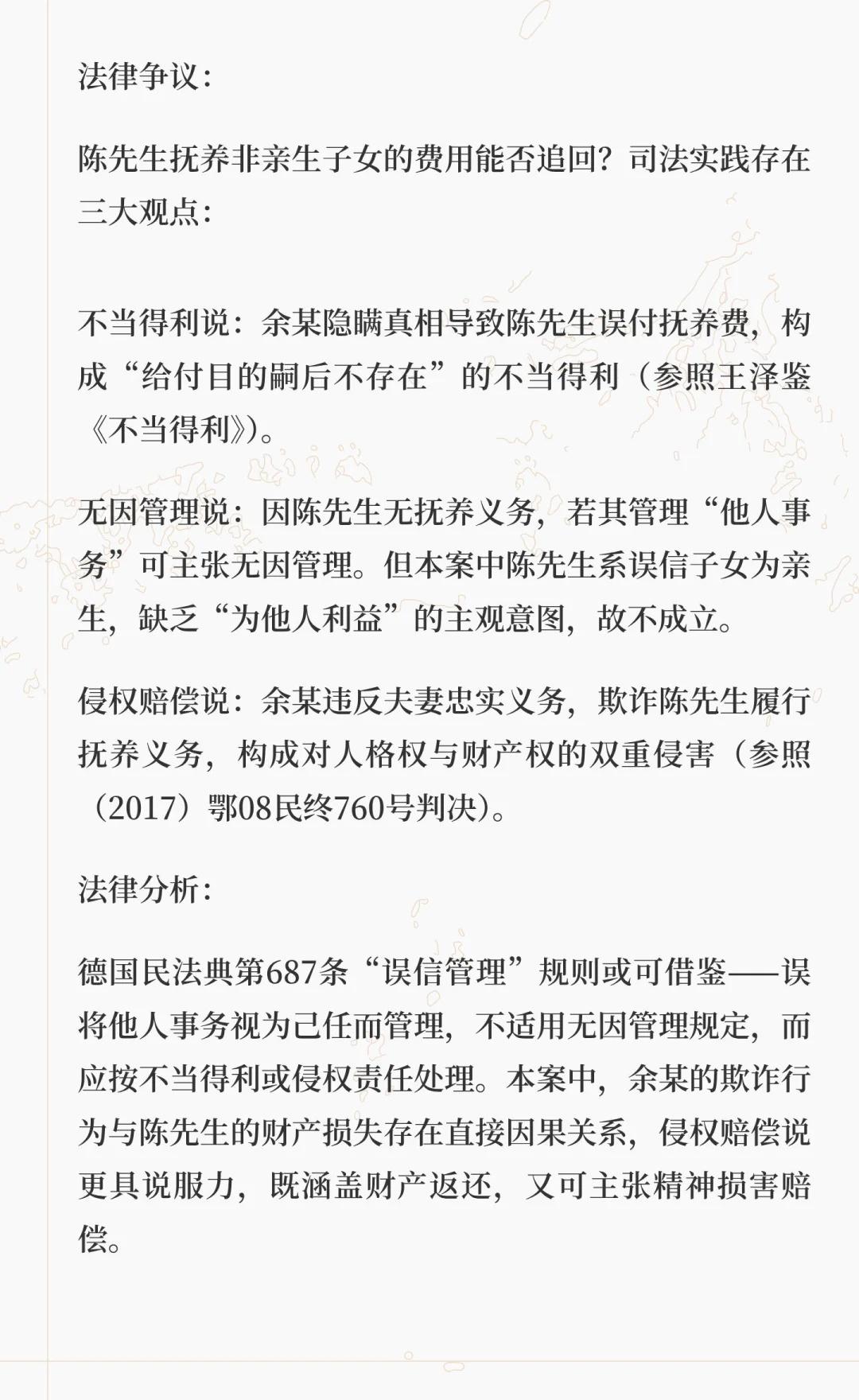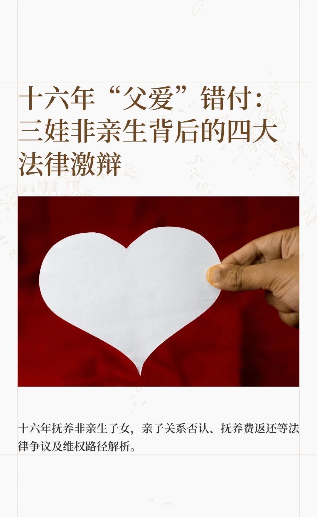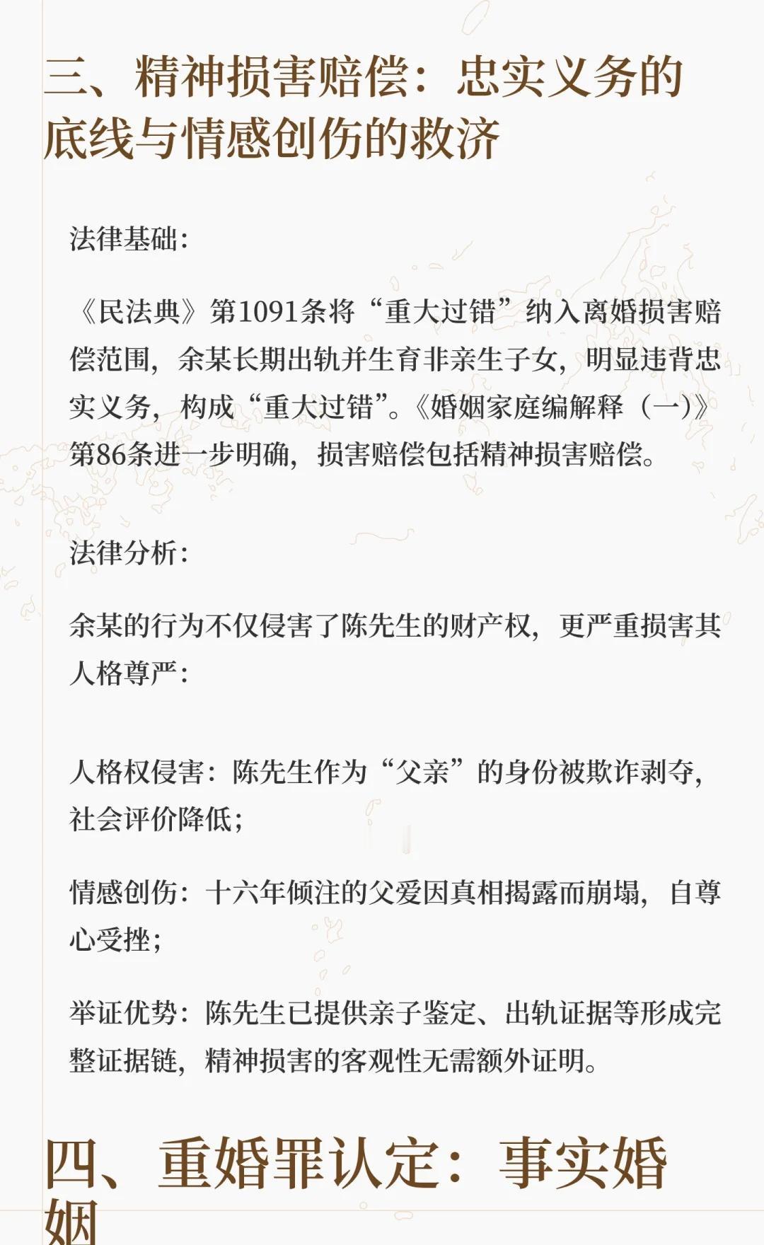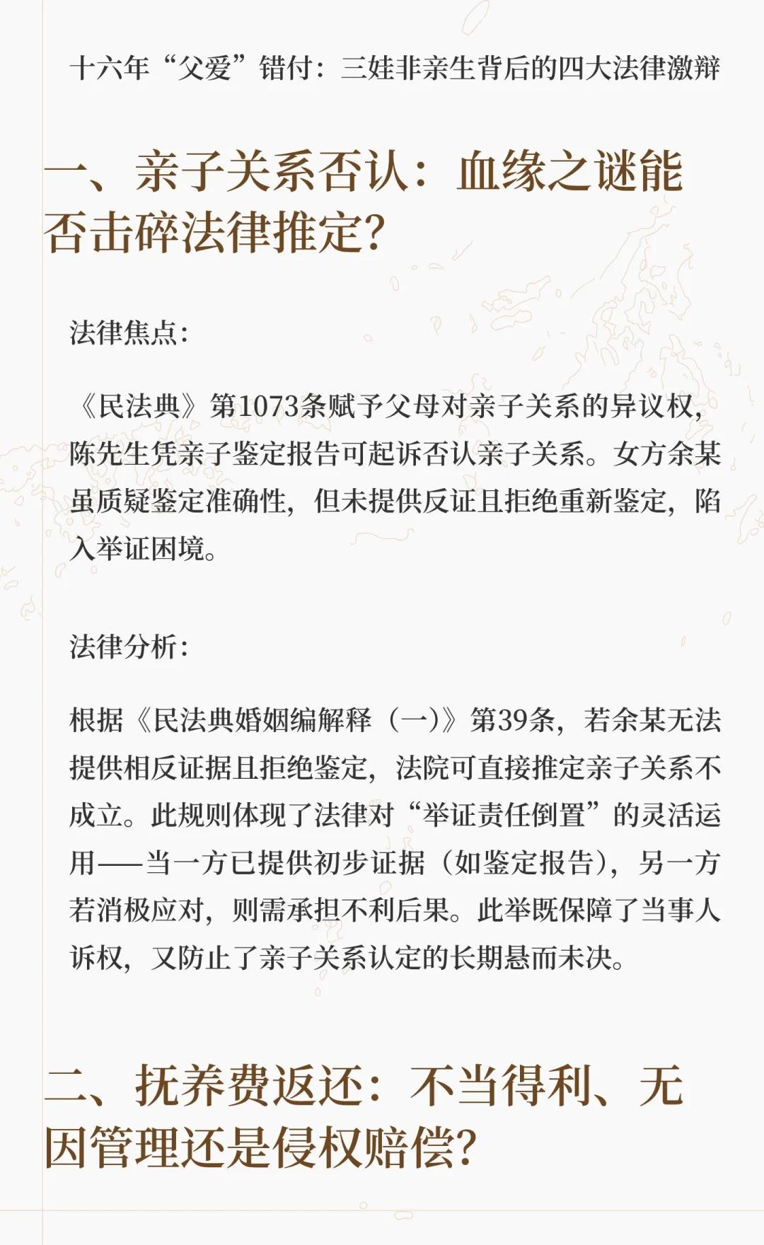 十六年“父爱”错付:三娃非亲生背后的四大 十六年“父爱”错付案中,陈先生抚养非亲生子女的费用能否追回、亲子关系能否否认、精神损害赔偿如何主张等法律问题引发争议。法院依据《民法典》和《婚姻家庭编解释(一)》,推定亲子关系不成立,支持陈先生抚养费返还请求,并认定余某构成重大过错,需承担精神损害赔偿责任。 法律服务 律师咨询 律师 北京律师 法律咨询 亲子鉴定 欺诈性抚养 否认亲子关系 欺诈性抚养赔偿