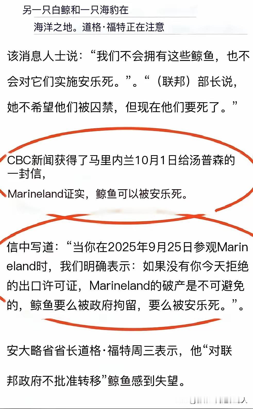 有毛病,加拿大海洋世界宁愿白鲸安乐死,也不卖给中国的珠海长隆海洋王国。 …… 据外媒报道,因经费紧张,加拿大安大略省海洋公园运营不下去了,计划将馆内30头白鲸出售给中国的长隆海洋王国,但遭到联邦政府的叫停。 加拿大渔业部长声称,他无法忍受这些白鲸被长期圈养囚禁。(立牌坊[我想静静]) 但业内人士表示,如果该海洋公园难最终破产,这些白鲸可能被实施安乐死! …… 珠海长隆海洋王国是世界上最大的海洋乐园,拥有专业的白鲸饲养和繁育团队。 三十头白鲸要是运过来,肯定能得到很好的照顾。 (虽然失去了自由,好死不如赖活着啊!安乐死问过白鲸同意没?)