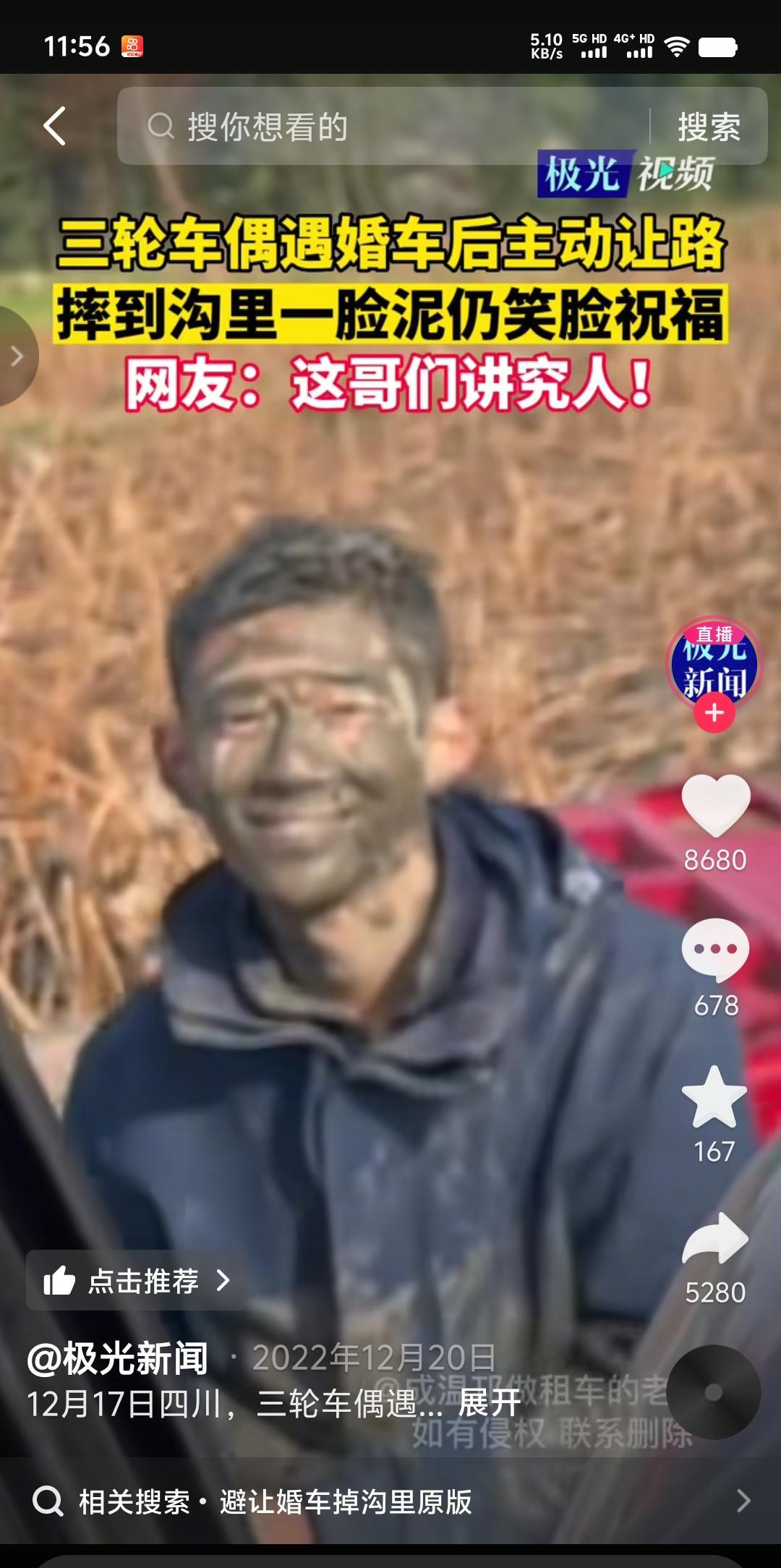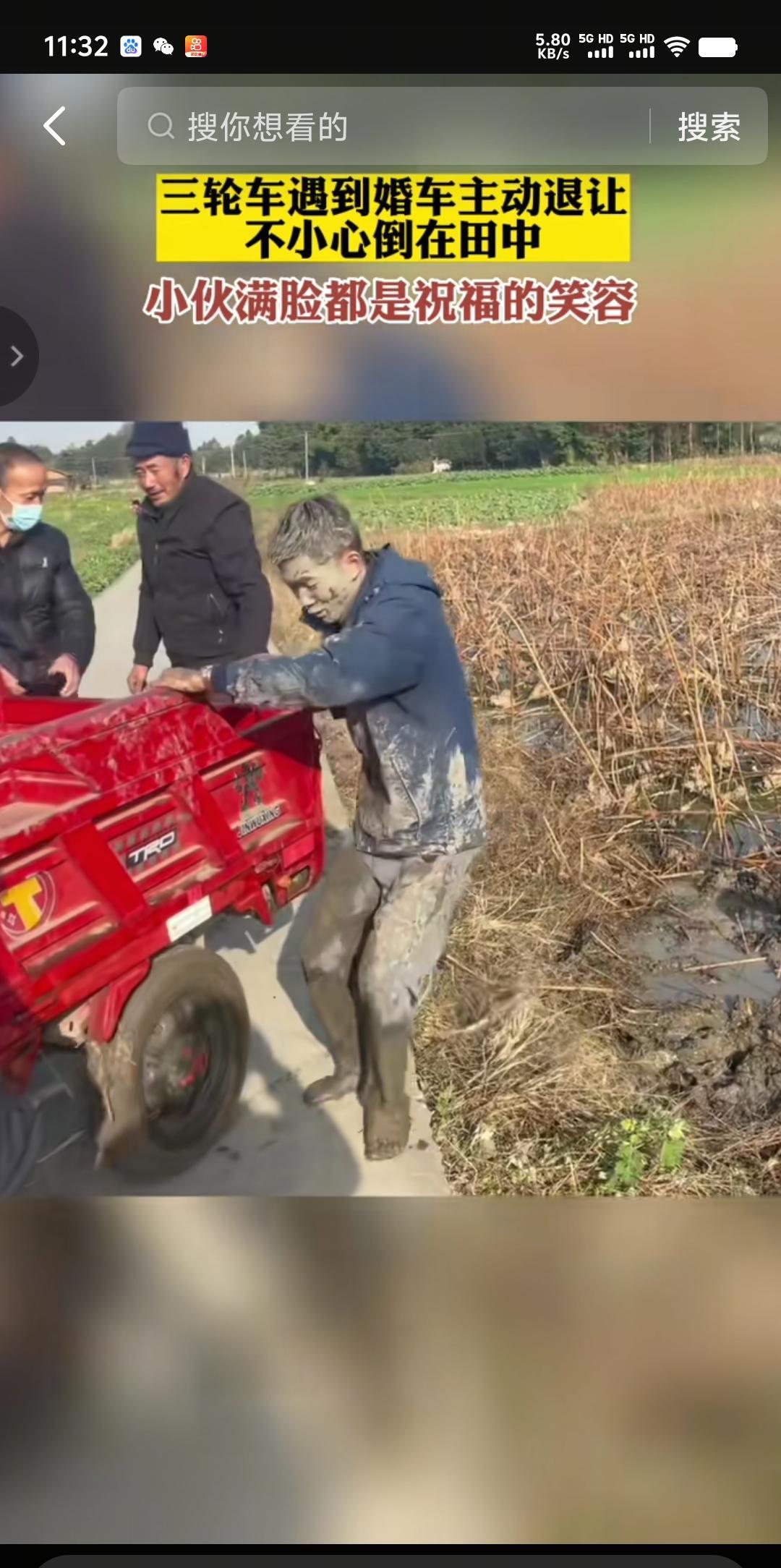 2022发生在四川一段骑三轮车小伙让婚礼车的视频火了,不是因为小伙主动避让婚礼车,而是因为小伙在避让过程中,不小心翻倒在稻田里,小伙满身是泥,非但没有生气,没有任何怨言,反而翘着二郎腿,微笑着祝福新郎新娘。虽然满脸是泥,但完全掩饰不住小伙那发自内心的纯朴和善良。婚礼车队通过之后,新郎赶忙安排亲朋好友将三轮车一起推了出来,而且给小伙递上了红包和喜烟。 狭路相逢退者胜,因为你让的不仅仅是路,更是一个人的胸怀和善良。