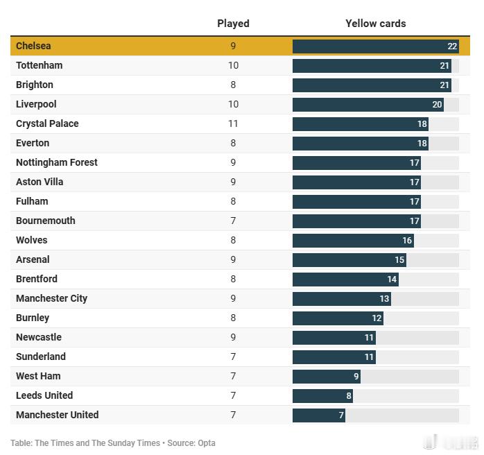 曼联 泰晤士报做了一个比较专业的图表,本来是分析切尔西新赛季纪律性差,吃黄牌和红牌过多,但我却发现了一个“秘密”,原来各项赛事吃黄牌最少的队,竟然是曼联啊!