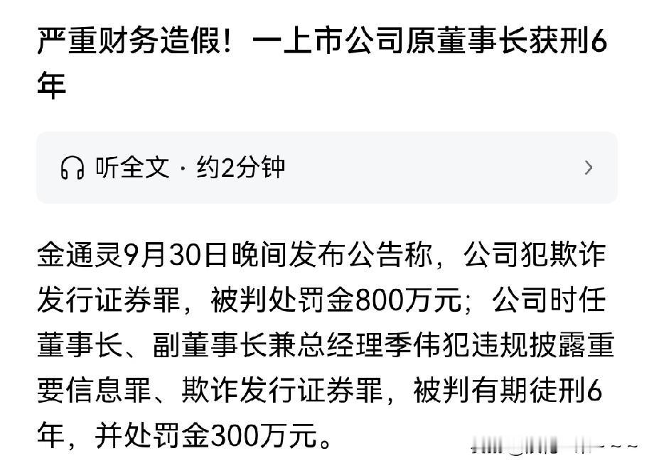 这算A股节后的大利好吗? 严重财务造假!金通灵公司原董事长获刑6年,罚金300万! 放假这几天,外围市场走的都比较好,特别是半导体,存储芯片,电力储能领域。 如果你记不住放假期间有啥大利好的话,把这个金通灵上市公司,董事长对股民不负责任,最终被判刑,记住就行了! 因为这样可以让我们在选股的时候,一定要把公司的基本面研究透,不要啥都不掌握就开始买。踩不到坑算幸运,万一踩到了那可是自己的辛苦钱。