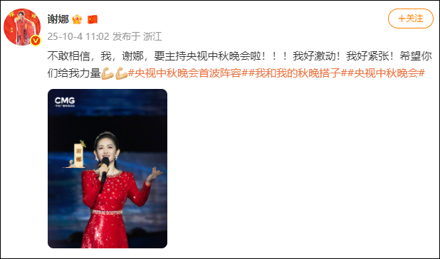 这也是谢娜作为主持人首次参加央视中秋晚会,10月4日,谢娜发文:不敢相信,我,谢娜,要主持央视中秋晚会啦!!!我好激动!我好紧张!希望你们给我力量
