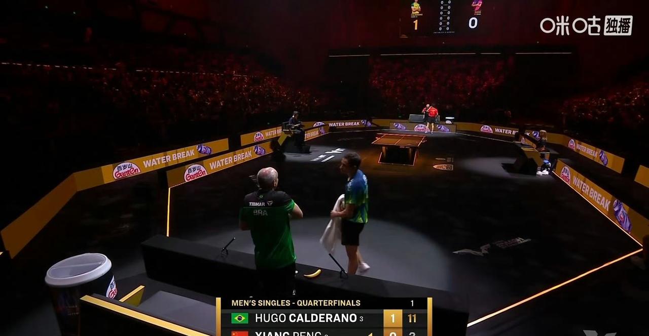 雨果🇧🇷开场第一个发球失误了! 但最终第一局向鹏🇨🇳3-11不敌雨果·卡尔德拉诺🇧🇷 ! 这一局应该全是雨果单方面的虐杀,向鹏和他硬扛确实扛不过。雨果的站位和跑位都非常灵活,一个转身就变了个击球方式。 反正这第一局果子就指着张鹏的正手大角度薅爽了。 但目前第二局局势反转了!!向鹏8-1领先[赞][奋斗]! 这是WTT中国大满贯男单1/4决赛,评论区继续播报战况!