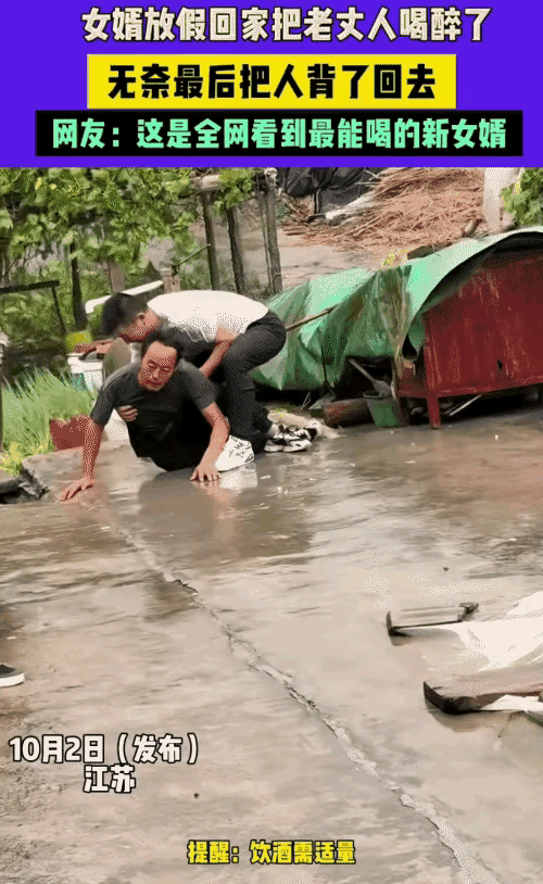 太搞笑了! 江苏,一女婿放假陪妻子回娘家,和老丈人喝酒。没想到,把老丈人喝醉了,老丈人走路走不稳。女婿立马背起老丈人回家。视频中,是个下雨天,还刮着风,屋外,老丈人趴在地上,女婿赶紧把老丈人扶起来,结果女婿扶着老丈人走到墙角处,老丈人又倒下,女婿只好把老丈人背起来,然后向家里的方向走去。 有网友评论: 岳父和女婿喝酒,要争个高低,分个输赢。要看岳父的年龄有多大,酒量如何?有没有高血压糖尿病?如果有这些病就要适可而止。年龄大酒量小更要少喝,不要把欢喜的事情,搞出烦恼来,就不可取了,其实即使女婿酒量好,要是和老丈人喝酒,也应该让着点老丈人,点到为止,这样那些好面子的老丈人,也不会觉得丢面子。 不过我觉得这喝酒还得适量,哪怕酒量再好,也不要贪杯,毕竟喝醉了,难受不说,还伤身体,像是在假期时,这种亲人团聚时刻,喝酒的话,喝上两杯就可以了,意思一下就好了! 我侄儿一米八几山东大汉,丈人家是西南地区某省,走亲戚的时候侄媳妇嘱咐他小心点,姐夫酒量很大,别喝醉了。 还没喝一半就把连襟喝桌子底下去了[笑哭] 我不知别人怎么想,但我总觉得到老婆娘家喝醉了是出洋相,丢了脸。出了丑。 对此,大家怎么看呢?
