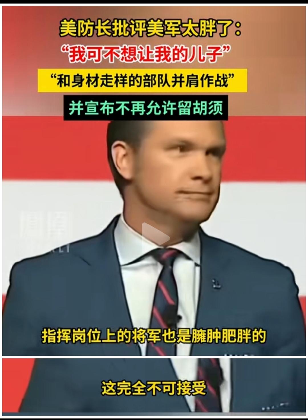 打骡子马惊。 万斯:赫格塞思说不许留胡须,指挥岗位上的将军肥胖臃肿不可接受,还说他不想让他儿子和身材走样的部队并肩作战,还抨击了性别“多元化、公平与包容”项目。那我这满脸胡须,还画眉眼烟熏妆、被质疑具有多样性的副总统是不是也不可接受? 赫格塞思:包括你。