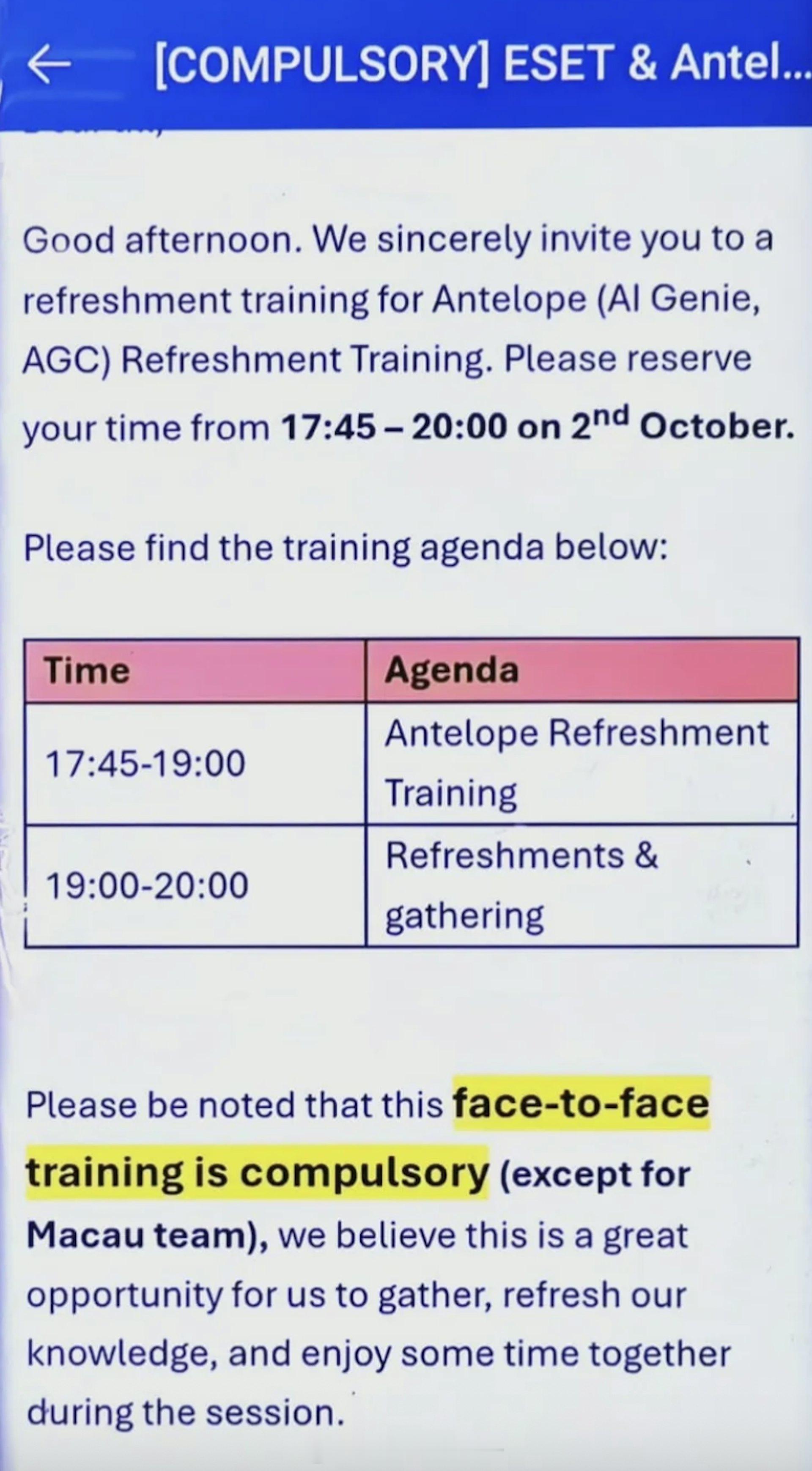 有传媒向滕丽名了解(具体事件:),滕丽名回复指,就事件问过老公,老公表示没有人辞职。滕丽名又强调老公当晚赶得及在七点多回家吃饭:"好彩仲赶得切看《爱回家》。"《香港01》发现,在报道"出街"后,网民又转贴报道,并贴出一张内部文件,文件中写上"培训"时间为5点45分至晚上8点,并标注是强制性面对面(face to face compulsory)。该回复也直斥"有人"讲大话:"讲大话不眨眼,公开埋公司发出的电邮。早上8:30返到夜晚20:00。没得早走。朱生发表完他的伟论已经19:00几,其他人没得走住,他坐火箭去吃饭?定自己就闪先人地就要继续加班?"