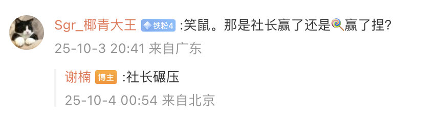 谢楠被吴所谓劝学吴所谓吴老二打架被教育的是谢楠 分享生活趣事,称吴所谓和吴老二打闹时向她呼叫支援,让拿顶门的大缸 。谢楠回应后,好奇这话的典故出处,吴所谓回答是《四世同堂》 。谢楠疑惑《四世同堂》是否有这样的台词,吴所谓调侃谢楠,除了看喜剧,也可以看看书 ,网友热评:儿子打架结果被教育的是妈妈[泪奔] 好想看现场啊哈哈