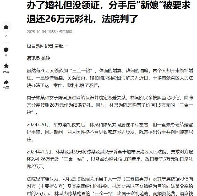 湖北十堰,林某和陈某网恋确定恋爱关系后定亲,林某父亲转26万彩礼,林某买1.5万“三金一钻”。2024年5月两人办婚礼但未领证,半年后因性格不合分手。林某一家起诉要求退彩礼等费用,最终调解让陈某退18万及“三金一钻”。 素材来源于:2025-10-04 13:53·极目新闻 林某和陈某本是在网络偶然相遇的两个人,可一次次热络的聊天,让他们很快擦出了爱情的火花,迅速确定了恋爱关系。随着感情升温,两家开始商议定亲事宜。 林某父亲满心欢喜,觉得儿子找到了好归宿,便按照当地习俗,郑重其事地给陈某父亲转了26万当作彩礼。 林某更是用心,他跑了好几家珠宝店,精心为陈某挑选了价值1.5万的“三金一钻”,金项链在灯光下闪烁着光芒,金戒指精致小巧,金耳环摇曳生姿,钻石更是璀璨夺目,林某满心期待着能和陈某携手走过一生。 2024年5月,阳光明媚,林某和陈某的婚礼热热闹闹地举行了。婚礼现场布置得美轮美奂,亲朋好友纷纷到场祝贺,大家都以为这对新人会一直幸福下去。然而,让人意外的是,他们一直没有去领结婚证。 同居的日子里,刚开始两人还如胶似漆,可时间一长,各种矛盾就逐渐浮现出来。 林某喜欢安静,下班后就想窝在家里看看书、打打游戏,而陈某则喜欢热闹,经常拉着林某去参加各种聚会。 在生活习惯上,两人也差异很大,林某比较节俭,陈某却花钱有些大手大脚。 这些小矛盾不断积累,终于在半年后爆发了。那天,两人又因为一件小事吵了起来,越吵越激烈,陈某实在受不了这样的生活,一气之下收拾东西搬回了娘家,还提出了分手。 林某和父母一下子慌了神,他们觉得为了这场婚礼,家里花了那么多钱,现在说分手就分手,这彩礼、“三金一钻”,还有婚礼费、改口费等7万块不能就这么打了水漂。 2024年12月,林某和父母经过一番商量,决定起诉陈某和她父亲。林某一家要求陈某一家退还所有费用。 陈某觉得自己在这段感情里也付出了真心,现在分手也不是她一个人的错,不应该退还这么多钱。 承办法官并没有急着下判决,而是耐心地了解双方的情况,分别做他们的思想工作。 法官告诉林某一家,虽然陈某提出分手,但也不能完全不考虑陈某在这段感情中的付出。也劝陈某,毕竟收了彩礼和“三金一钻”,从情理和法律的角度,都应该适当退还一部分。 那么,这件事用法律该如何看呢? 彩礼返还问题,主要依据《民法典》婚姻家庭编的相关规定。 民法典第一千零四十二条规定,禁止借婚姻索取财物。这里的彩礼返还并非基于借婚姻索取财物这一违法情形,而是针对双方未办理结婚登记手续的情况。 当双方未办理结婚登记手续时,按照民间习俗给付的彩礼,给付方有权请求返还。这是彩礼返还的一般构成要件。 林某和陈某虽然举办了婚礼,但并未办理结婚登记手续,从法律形式要件上看,符合彩礼返还的请求条件。 不过,法律在规定彩礼返还时,并非一刀切地要求全部返还。 民法典及相关司法解释也考虑到实际情况中的复杂因素,比如双方共同生活的时间长短、是否生育子女、彩礼的使用情况、双方的经济状况以及导致感情破裂的过错等因素。 林某和陈某共同生活了半年时间,在这期间,双方共同经历了生活的点点滴滴,虽然最终因性格不合分手,但陈某在感情和生活中也有一定的付出。所以,不能简单地要求陈某全额返还彩礼。 经过法官多次耐心的调解,双方的态度终于有所缓和。最后,陈某答应退还18万彩礼,这个金额占林某父亲所转彩礼26万的约69.23%,还退还了“三金一钻”。 此次调解让陈某退还18万彩礼,占林某父亲所转彩礼 26 万的约 69.23%,同时还退还了“三金一钻”。 从彩礼返还比例来看,69.23%的返还比例,考虑了林某一家为结婚支付了较大金额的彩礼的事实,对陈某在共同生活期间的付出,也有一定的认可。 虽然双方未办理结婚登记,但共同生活半年,陈某在生活上必然有一定的投入和情感付出,所以适当扣除一部分彩礼作为对其付出的补偿是合理的。 对于“三金一钻”,由于其属于以结婚为目的的赠与财物,在双方未达成结婚目的的情况下,陈某应当予以返还。 此次调解结果为:陈某退还18万彩礼(约占69.23%)及“三金一钻”,有效平衡了双方的利益。 只是,这段曾经被寄予厚望的感情,最终却以这样的方式收场,实在让人唏嘘不已。您对这件事有什么看法呢?