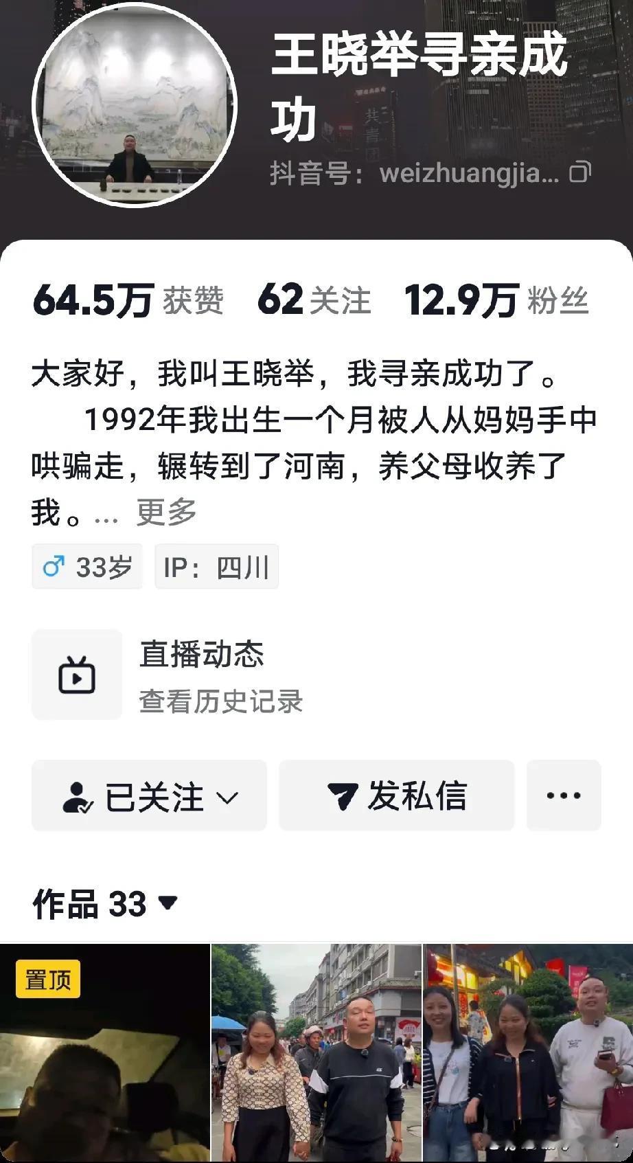 我觉得王晓举想要带货有点不太现实。 因为我前天就看到王晓举的账号粉丝就12.9万, 然而现在看还是12.9万, 不管她怎么发视频,怎么直播粉就是上不去, 昨天还看他更新视频了呢, 视频里有他的媳妇,老妈,孩子,还有同父异母的兄弟姐妹们, 然而王晓举还是以一个大孝子的身份,牵着妈妈手,给妈妈买好吃的, 但是我不知道这样的画面能持续多久, 会不会像豫抱抱那样到时候和父母,和兄弟姐妹闹掰。 这个都不好说[捂脸]