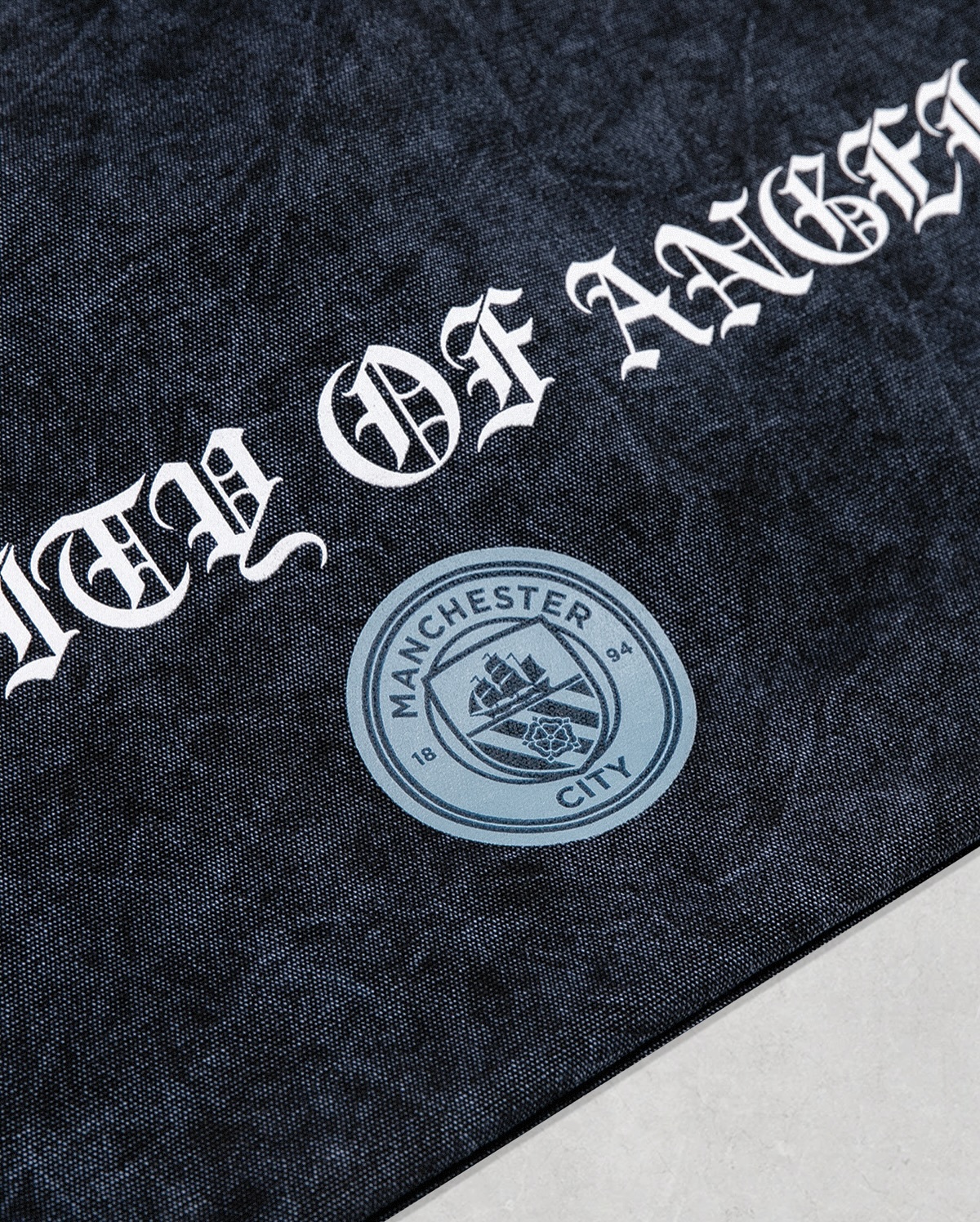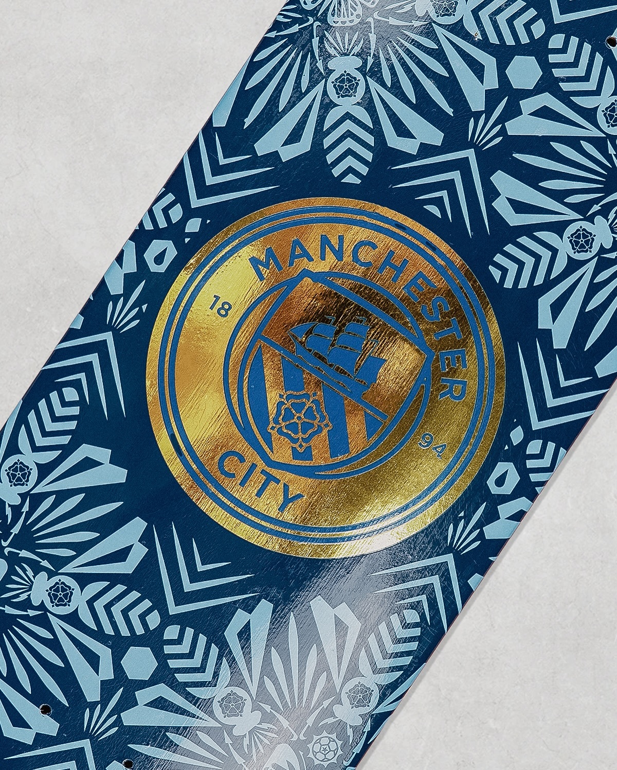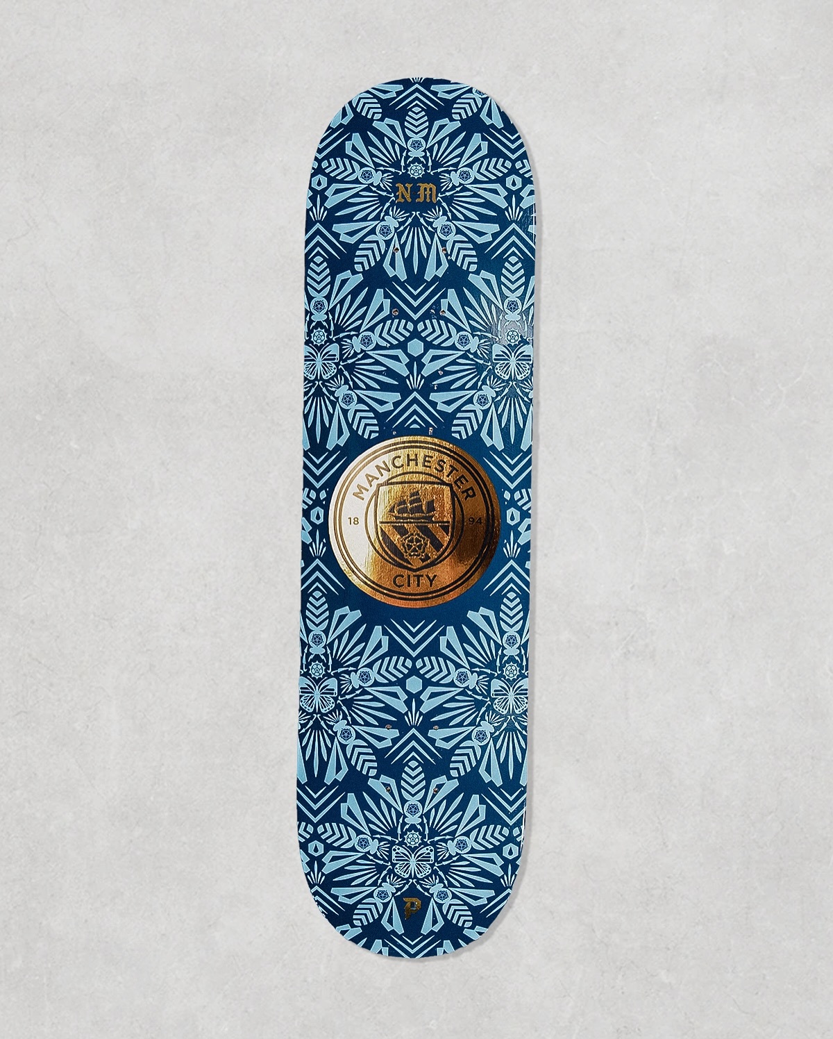 该系列由洛杉矶艺术家Francisco Reyes Jr.设计,将曼城的传承精神与洛杉矶的创作能量巧妙融合。系列内含标志性滑板板面、托特包、方巾及传统足球围巾。