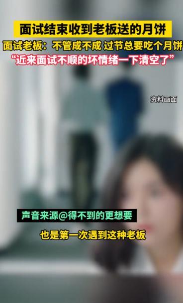 “太有人情味了!”2025年9月,河南新郑,一男子面试结束收到了老板送的月饼,老板表示过节总要吃个月饼,这让男子感觉最近找工作不顺积累的坏情绪被清空,网友:有这样的老板,公司肯定会越来越好! 现在找个合适的工作确实不容易,在找工作的过程中,不少人越来越焦虑,也越来越没有信心,积累的坏情绪到达极限真的会被压垮。 一男子连续面试了几份工作,不是自己不满意公司,就是公司不满意自己,手里的积蓄越来越少,男子十分焦虑,可为了赶紧找份工作,他没时间去调整自己的心情,只能继续去面试。 这天,男子在一家公司面试结束后,公司老板送给他一个月饼,男子有些不可思议,老板表示,不管面试成不成,这马上就要过中秋节了,总要先吃个月饼吧。 男子接过月饼,这家公司老板的行为让男子感觉到自己被关心,感觉近来找工作不顺心的坏情绪好像一下子被清空,着实被这个老板“暖”到了。 不少网友觉得这家公司的老板很有人情味,俗话说做事先做人,有这样温暖的老板,工作氛围估计也不会差,公司一定会越发展越好的! 信息来源:《面试结束收到老板送的月饼面试 老板:不管成不成过节总要吃个月饼“近来面试不顺的坏情绪一下清空了”》法治进行时