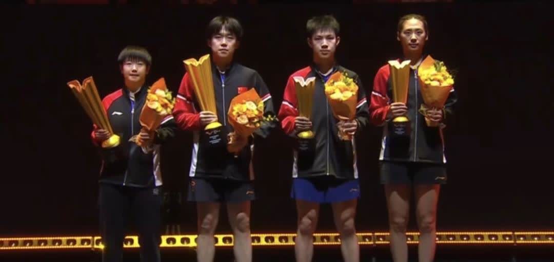 没想到陈熠这么高 都跟王楚钦差不多高了 照相这一方面,孙颖莎还是有点吃亏,本来自己长得不矮,无奈旁边是三个大高个。 但是拿冠军还是孙颖莎经验多,颁奖就穿长裤,拍照穿长裤比较正式。 这次主办方整得挺好的,烟花和鲜花都准备了,但是冠军奖杯是不是有点重,看着孙颖莎拿着挺费劲得,都拿不动了。 图片源于网络