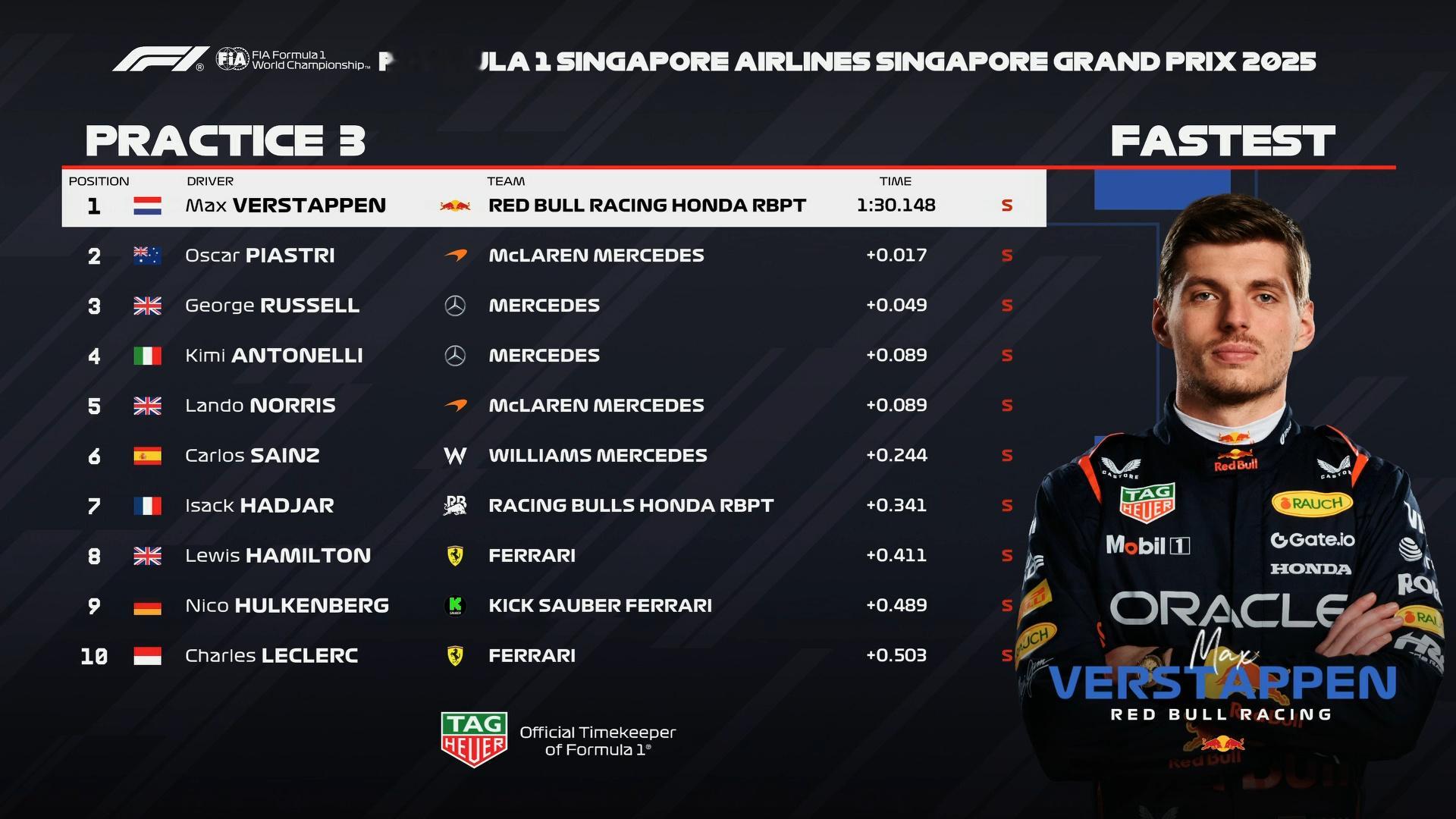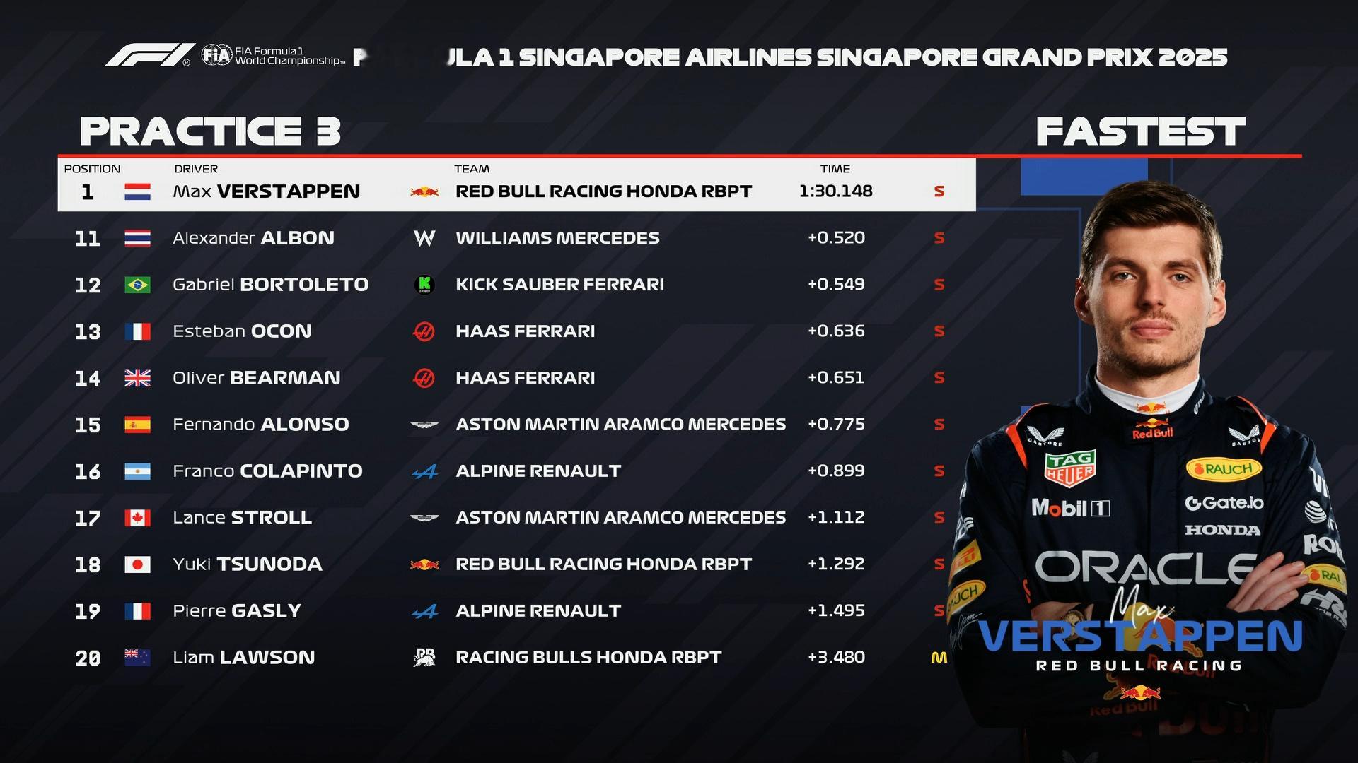 新加坡大奖赛三练成绩表如图,北京时间21点排位赛!F12025F1新加坡大奖赛