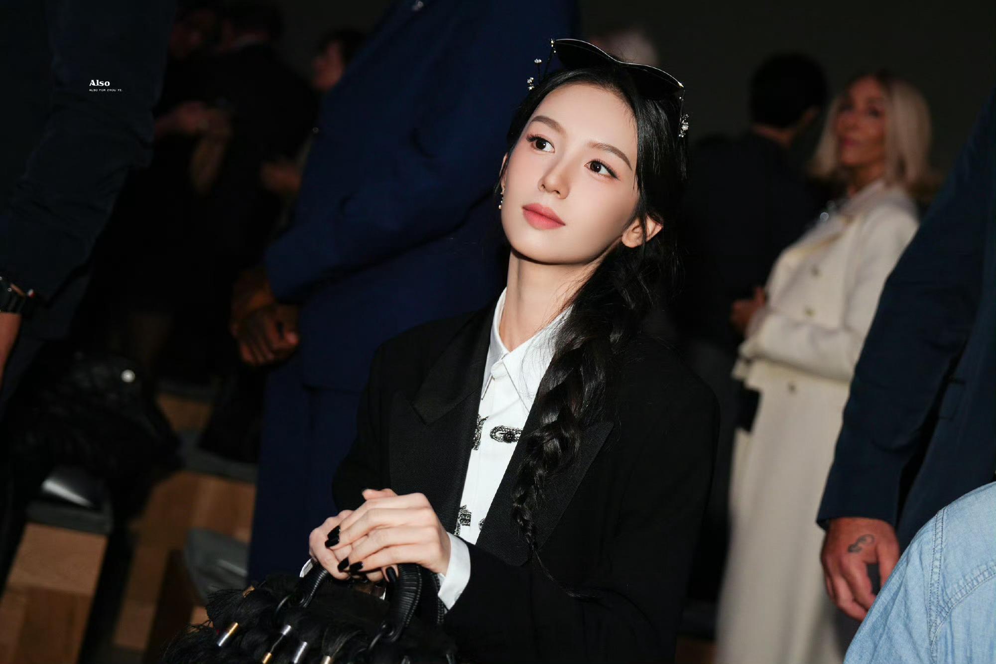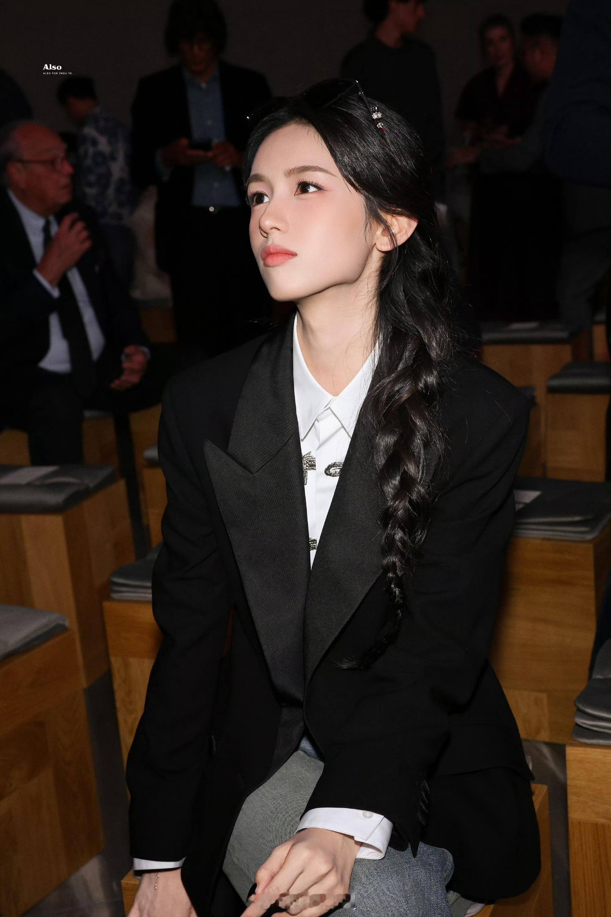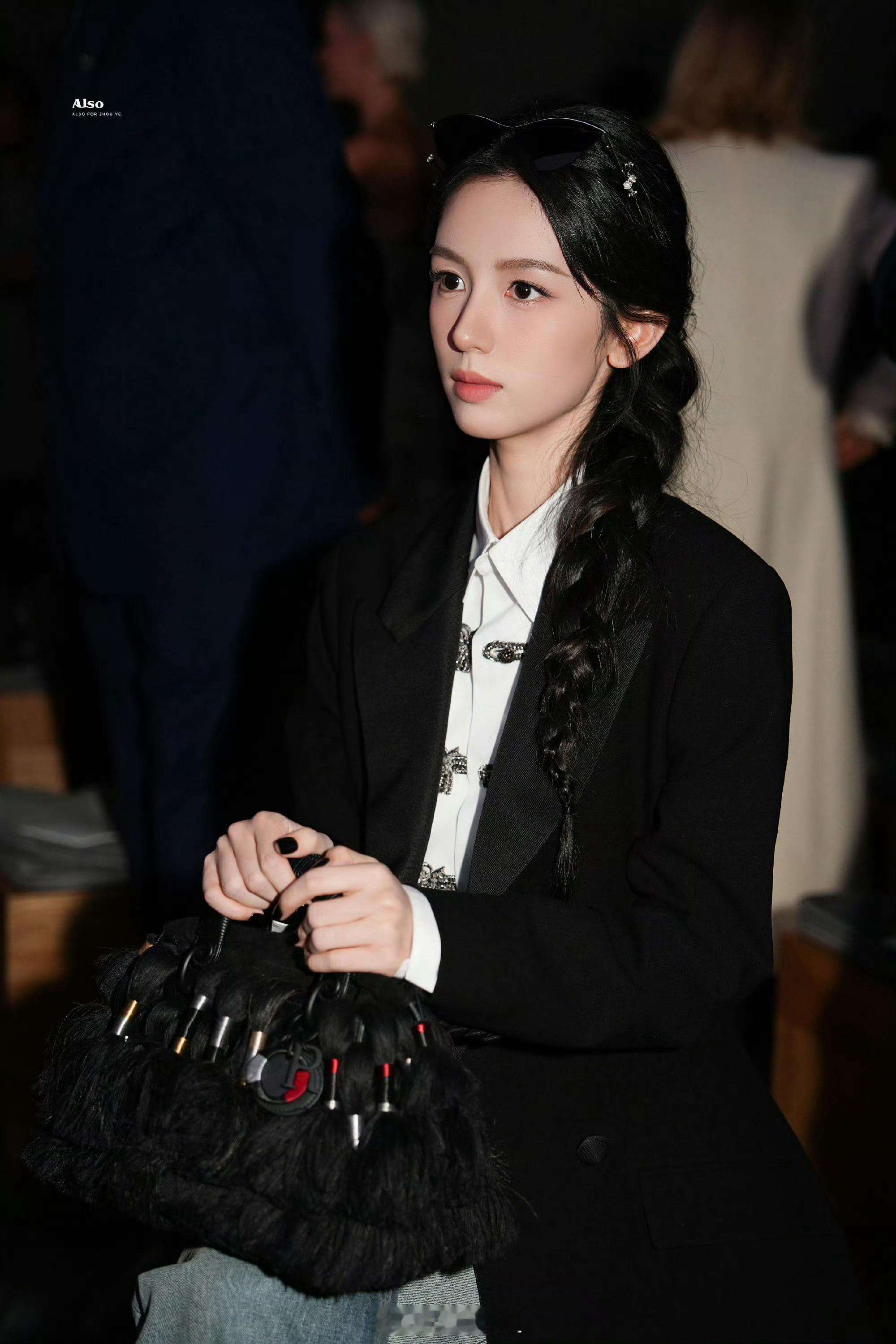 周也的巴黎时装周内场路透来了,一身黑色西装搭配单边麻花辫,整个主打的是黑色系妆造