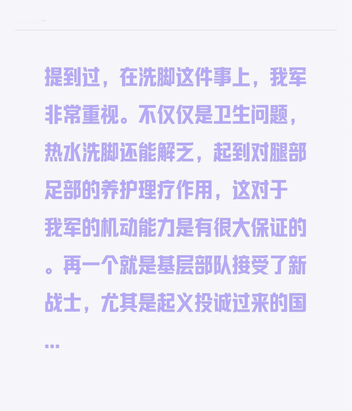 有文章曾探讨过我军为何能成为“铁脚板”,关键就在于行军后必定要用热水洗脚。我军对洗脚一事极为重视。这可不只是卫生问题,热水洗脚既能解乏,还能对腿部和足部起到养护理疗的作用,极大地保障了我军的机动能力。 再者,基层部队接收新战士时,若是有从国军起义投诚过来的士兵,班长甚至会亲自为他们洗脚,这让这些解放战士感动不已。在国军时,长官对他们只有盘剥和虐待,来到这边却是官兵一体,平等且真诚地相待,他们的思想立场转变迅速且坚定。