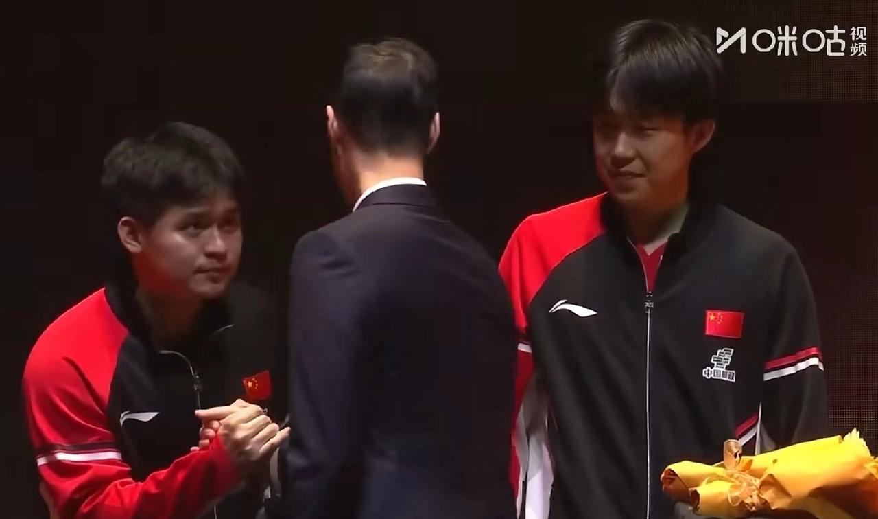 男双颁奖礼,王励勤为王楚钦和林诗栋颁花。 能看得的出来王励勤很开心,笑着握手后还