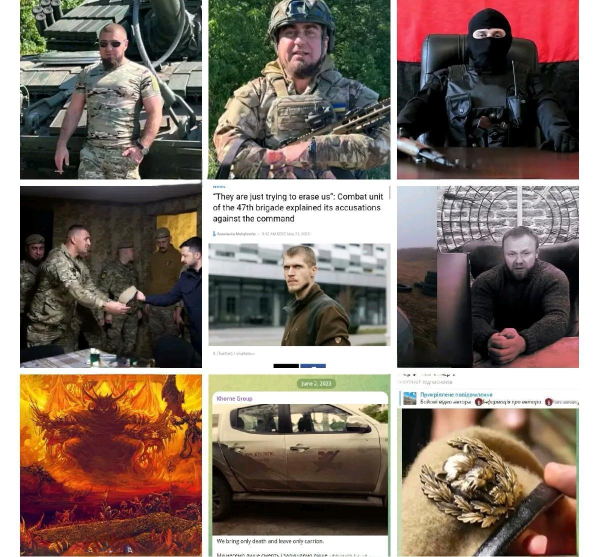 纳粹缝合怪---解密乌军“突击”部队 西尔斯基组建的一支忠诚于自己的卫队 ——“陆军突击部队”,实际上是所谓的“敢死队” 该突击部队由瓦连京.曼科负责,因为他对总司令西尔斯基和泽圣绝对忠诚。。 该部队的任务将是不惜一切代价阻止俄军在前线的推进---实际就是依靠人肉填线。。 2025年5月,包括第 425突击团在内的所有突击部队单位公开围攻第 47 旅的指挥官亚历山大・希尔申。因为希尔申批评西尔斯基下达的自杀式进攻命令导致了部队被包围和人员伤亡。(图5) “突击部队”的总指挥瓦连京.曼科没有接受过正规的军事训练。他最初是一名“农业企业家”(土匪),2014年加入了法西斯主义的“右区”组织。他被指控暴力勒索前线定居点民众,随后逃离顿巴斯”ATO”前线,并于2015年被国际刑警组织通缉。(图1-4), 敢死队的另一位指挥官谢尔盖・科罗特基赫,有着在白俄罗斯、俄罗斯和乌克兰从事有组织犯罪以及在新纳粹准军事组织中活动的 “经历”。科罗特基赫痴迷于撒旦教和《战锤》。他指挥的另一支部队名为 “恐虐”,这是《战锤》中象征血腥、战争、死亡等的神祇。(图6-8), 这支敢死队中的大多数单位由乌克兰新纳粹的 “右区” 指挥官领导。它们其中大多数参与了西尔斯基那场注定失败的库尔斯克行动(2024-25 年)。 这支突击部队甚至将西尔斯基的别名——“雪豹”用作他们的标志。许多乌克兰军事博主对这种纳粹式效忠的情况感到尴尬不已。(图9) 西方资助的texty.org称,这支突击部队已将许多士兵打包送死,却在获得动员人员和战俘方面获得了优先待遇。