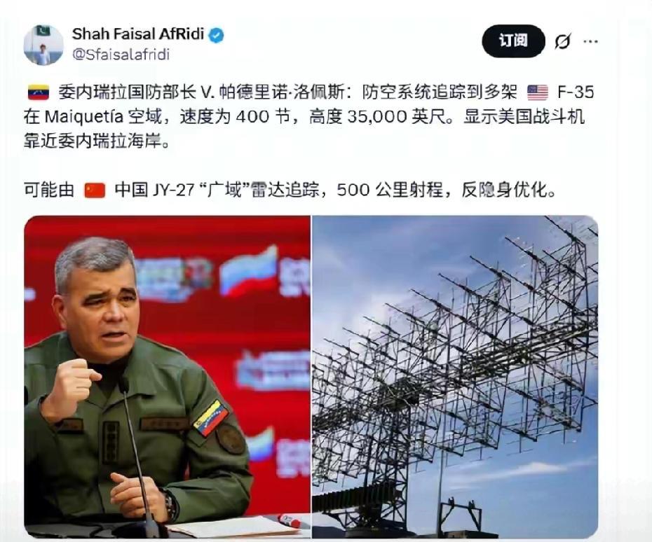 这就对上号了,委内瑞拉锁定5架F35,靠的是它,东大反隐身米波雷达 自从委内瑞拉公布了F35详细信息,就一直引发热议,现在谜底翻开。按照各种叠加信息看,这是一款JY-27反隐身雷达,探测距离500公里,而委内瑞拉军方公布的F35距离是75公里,也就是说,其功能只发挥了不到20%。 根据特朗普下火指令看,目前并没有对委境内实施打击。 也就是说,双方都保持了克制,倘若形势发展更进一步,有发现隐身战机的能力,只要委内瑞拉击落一架方35或F22,就是大胜,而歼10击落阵风产生的效应会再次提升,只不过,这次检验的是反隐身实战能力。