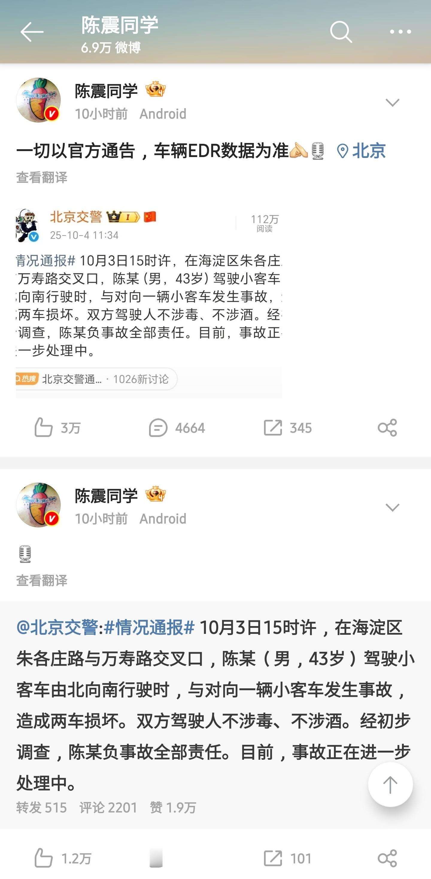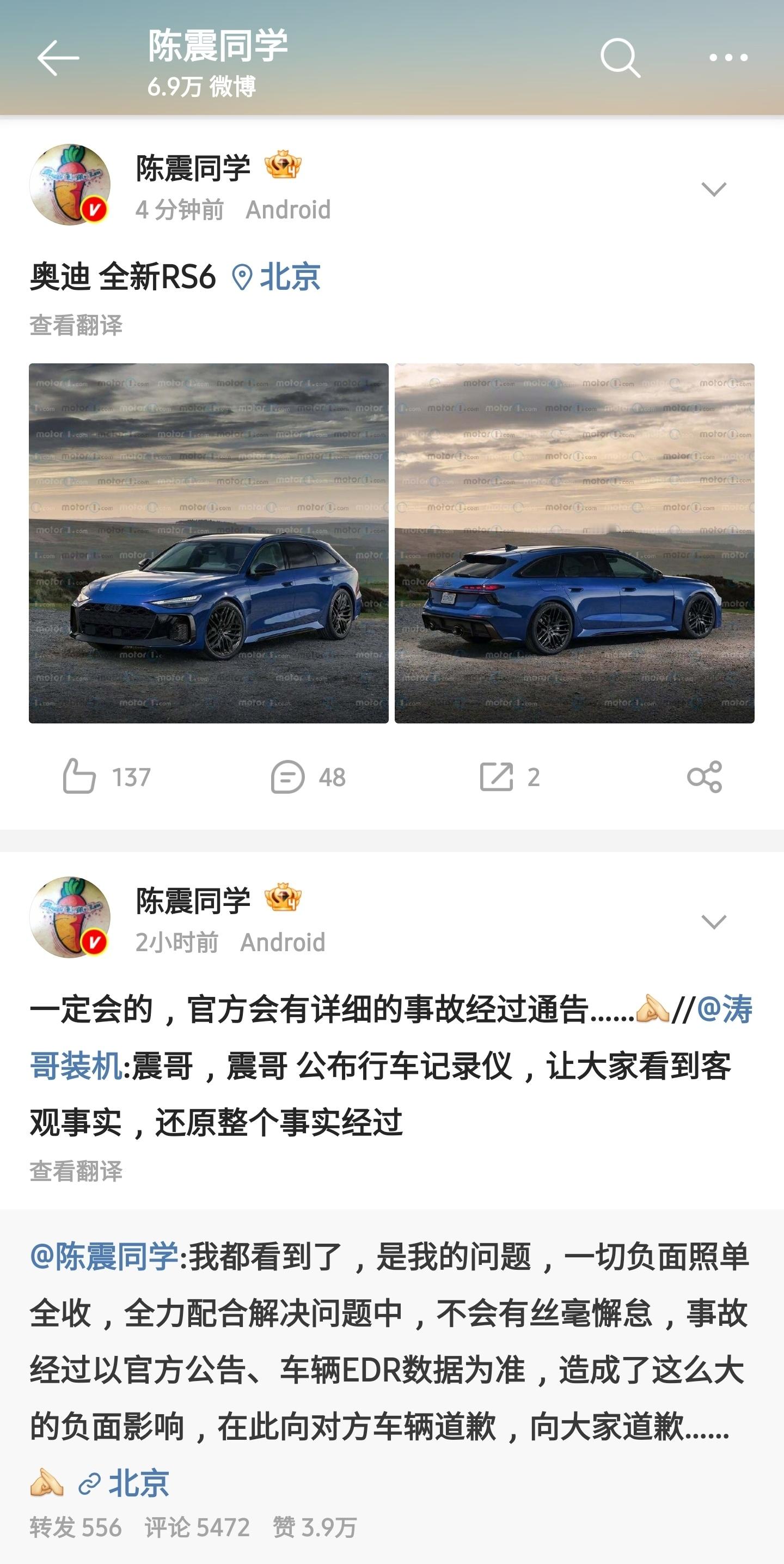 陈震道歉了,为自己劳斯莱斯豪车事故道歉,说一切都是自己的错,自己全力配合解决问题,事故经过和结果以官方通报为准,他自己为造成这么大负面道歉,也为被他撞的车主道歉。