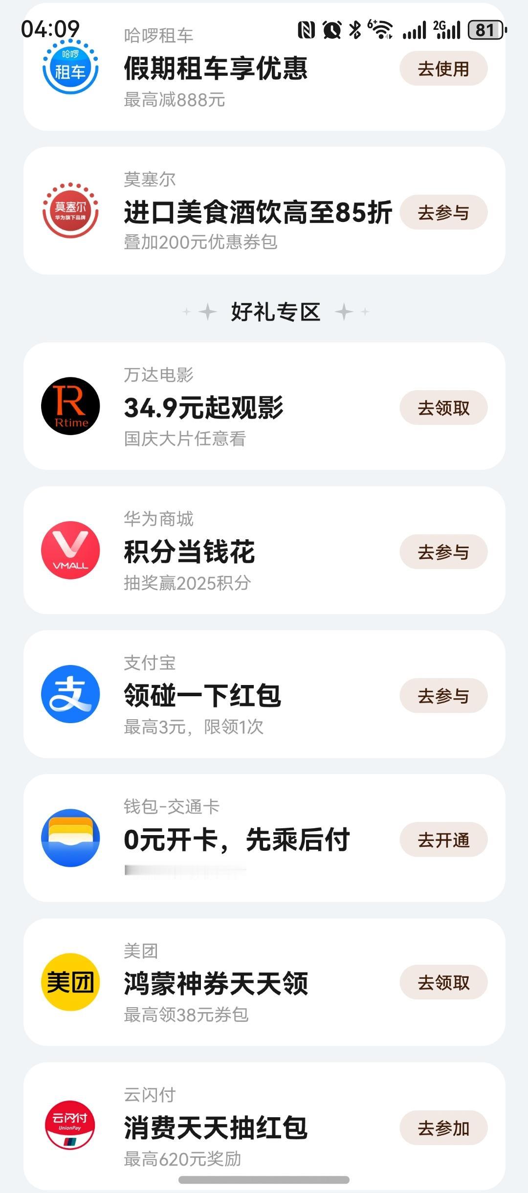 国庆假期余额只剩一半,前四天鸿蒙天天给我送10元券,我喝了几天咖啡~你们呢? 华为用户们还有谁没领的吗?走过路过勿错过。更新鸿蒙5系统之后,在负一屏的“鸿蒙有”礼进去领取,每天一张,另外还有别的福利可以按需选择,比如支付宝碰一碰红包等。 鸿蒙5系统目前用户数已突破2000万,华为不仅携手合作伙伴在努力完善鸿蒙生态,还持续给到升级鸿蒙5的用户各种福利,真的很用心,也很有诚意。 诚然,鸿蒙5的应用还存在这样那样的不足,但任何操作系统从诞生到完善都需要时间,不可能有哪个系统一出来就面面俱到的,生态更是需要长期积累和推进。 如果经历过iOS和Android早期的发展,相信都还记得曾经的各种不成熟,甚至早期系统都是英文的,从这个角度应该能理解如今鸿蒙的不易。系统、生态、用户,共同成长才是良性发展。鸿蒙,如今也是在这条路径上努力前行,真实用户也能看到鸿蒙的持续进步。鸿蒙,加油!