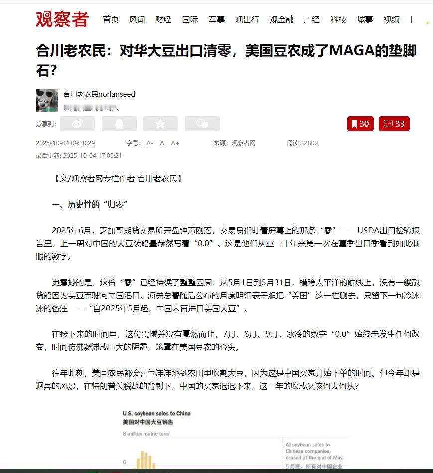 胡锡进:特朗普团队已经意识到,在关税战中,大豆正成为中国除稀土外,又一个强有力的武器。美国农民的收割已拉开帷幕,而今年中国至今未购入一船美国大豆,这让美国农民们陷入极度焦虑,特朗普也非常着急与中国达成协议。 自打1998年有记录开始,中国还是头一回在大豆收获季,对美国大豆零采购。但这事儿说到底,都是特朗普团队当初打关税战惹出来的麻烦。2024年大选前,特朗普为了兑现“让美国农民再次伟大”的承诺,不管不顾对中国商品加征了60%的关税,想着这样能逼中国在芯片、稀土这些领域让步。可他没算到,中国反手就捏住了美国农业的“七寸”。 暂停买美国大豆。彭博社之前就报道过,现在对美国大豆种植者来说,时间早已经不够用了,就算这会儿中美能谈成协议,对那些已经丢了最大客户的农民来说,也太晚了。 要知道,中国在全球大豆市场上的分量,可不是一般的重,咱们每年要买走全球大豆出口量的60%左右,妥妥的最大买家。往年咱们买的大豆里,差不多五分之一是美国豆农种的,这份额占了美国大豆出口量的一半。 现在中国一不买,美国大豆市场直接从“卖方盼着买家来”变成了“买家说了算”,巴西和阿根廷立马瞅准机会,把大豆一船船往中国运,咱们这边应对起来,根本没半点慌的。 巴西这两年的动作是真快,之前十年里,巴西政府砸了300亿美元升级港口和铁路,现在大豆从巴西农场运到中国港口,只要18天,比以前快了不少,成本还降了四成。更关键的是,巴西大豆用的免耕技术,每公顷产量比美国还高12%,价格却低8%。 这种又好又便宜的豆子,咱们买家自然愿意选,2025年1到8月,巴西给中国运了6600万吨大豆,占了他们出口总量的75%,创了历史新高。那边巴西豆农仓库外,装豆子的卡车排成长龙,港口货轮昼夜不停装货,跟美国中西部的冷清比起来,简直是两个世界。 美国大豆协会的首席经济学家斯科特·格尔特后来也不得不承认:“中国市场的大门一旦关上,可能就再也不会为美国打开了。”事实也确实如此,2024年美国大豆在中国市场的份额,从最风光时的40%掉到了21%,而巴西直接占了71%,妥妥的主导地位。 其实中国能这么稳,不只是靠换卖家,咱们自己也在使劲儿,没把鸡蛋全放进口的篮子里。这几年东北黑土地上,悄悄搞起了大豆“革命”——黑龙江绥化那边的万亩大豆田,无人驾驶播种机来回跑,精准播种施肥,现在这儿的大豆单产,比五年前提高了25%。 这背后是咱们的“大豆振兴计划”:种大豆的农民,每亩能拿300元补贴,还免费给高蛋白种子,政府还建了大豆科技园区,专门搞技术研发。2024年的时候,中国大豆种植面积突破了1.5亿亩,产量达到2300万吨,自给率从2018年的15%涨到了22%。 更厉害的是,咱们科学家培育的“中黄6106”大豆,蛋白质含量高达45%,直接打破了美国对高蛋白大豆的垄断。现在就算完全不买美国大豆,国内饲料产业也能保住80%的产能,心里有底自然不怕。 反观特朗普这边,当初打关税战时想得挺美,结果把自家农民坑惨了。美国大豆价格跌了23%,可种植成本因为关税涨了15%,农民每公顷要亏1500多美元。特朗普政府没辙,只能拿出120亿美元给农民发补贴,可这钱是纳税人的,不少人吐槽这是“拿老百姓的钱填贸易战的窟窿”,根本不是长久之计。 现在再看这场大豆较量,其实早不是简单的买卖事儿了,它藏着大国博弈的门道——粮食早就不是普通商品,而是能影响战略主动权的武器。中国用“多找卖家+自己增产”的法子,不光破了美国的农业霸权,还让全球粮食贸易的规则慢慢变了样,就像国际粮食政策研究所报告里说的:“中国正在重新定义全球粮食贸易规则。” 而美国这边,大豆危机把他们经济结构的毛病暴露得明明白白。特朗普政府想靠关税保护本土产业,却忘了美国农业早就跟全球供应链绑在一起了,这种“杀敌一千自损八百”的做法,不光让农民丢了中国这个大市场,还让美国在国际经贸里越来越孤立。 说实在的,这粒小小的大豆,其实写了本新时代的“大国博弈教科书”——谁能握住关键资源的控制权,谁就能在竞争里占上风。现在美国农民还在为满仓库的大豆发愁,巴西忙着扩大种植,咱们中国一边稳进口,一边提产能,你觉得往后美国还能靠农业卡别人脖子不?要是特朗普真跟中国谈成协议,美国大豆还能抢回失去的市场不? 参考资料:观察者网