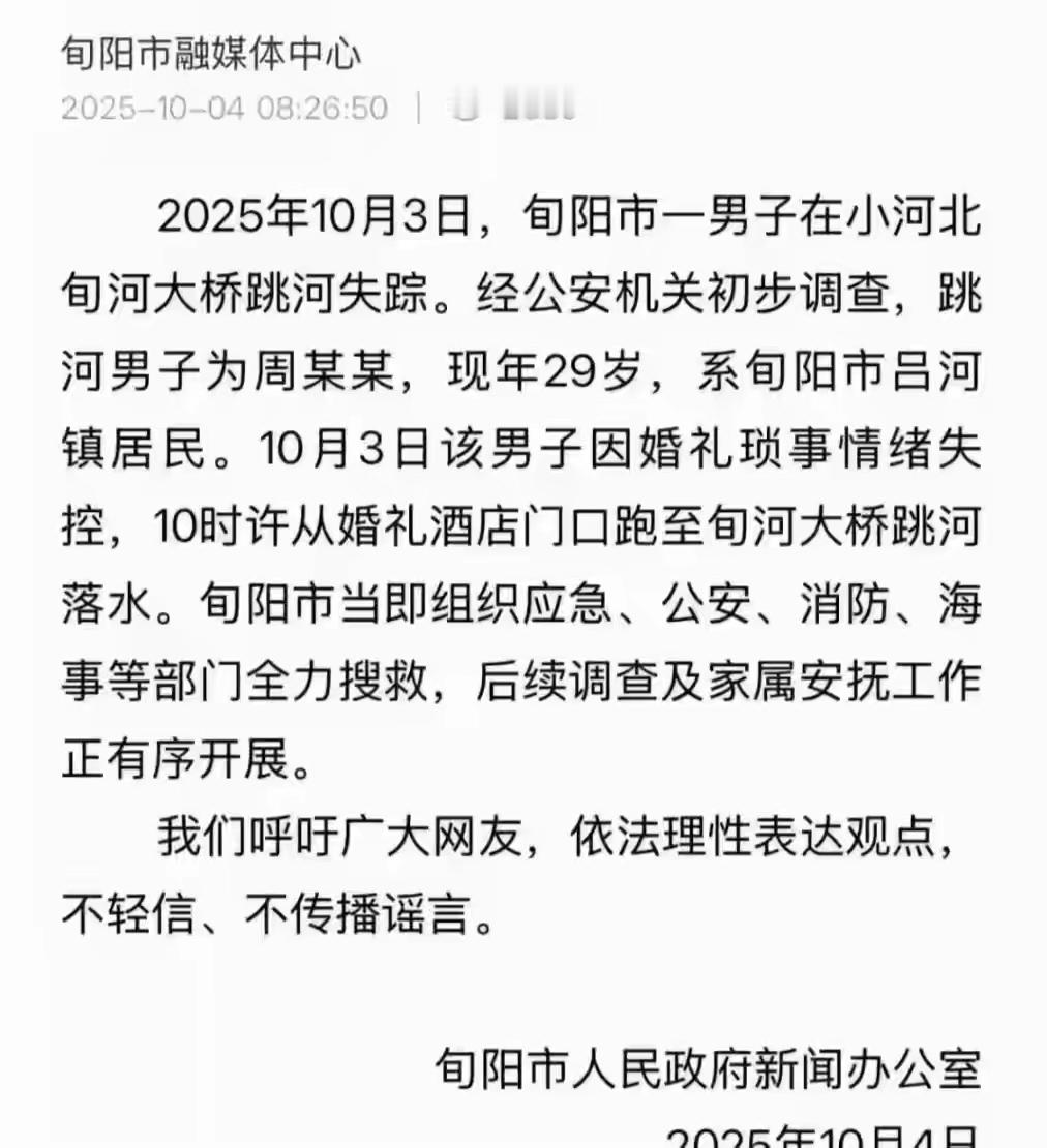 10月3号陕西安康旬阳的一个婚礼,成了一场悲剧,这件事也有了最新的进展!29岁的新郎本该在酒店接亲,却突然情绪崩溃,疯跑向旬河大桥纵身跳下。 官方通报,说不是网传的 “天价彩礼逼的”,只是 “婚礼琐事情绪失控”,可网友哪能平静?婚车司机也曝料了一些情况,证实悲剧发生前就有些异常:接亲路上新郎新娘就一路吵,两人还是高中同学,处了 很多年了,却在婚礼上发生这样的悲剧! 对最熟的人往往最狠,哪句话戳心就说哪句,或许就是这积压的矛盾,让新郎在大喜日子扛不住了。有人骂他不够成熟,可更多人疼他 —— 现在结婚压力多大?彩礼攀比、仪式复杂,心里的苦没处说,要是早有人疏导,哪会走到这步? 最可恨的是乱传谣言的人,说是彩礼问题,对着家属伤口撒盐;希望这场悲剧能够警醒其他人,别让喜事因为一点点小摩擦,成了压垮人的最后一根稻草!