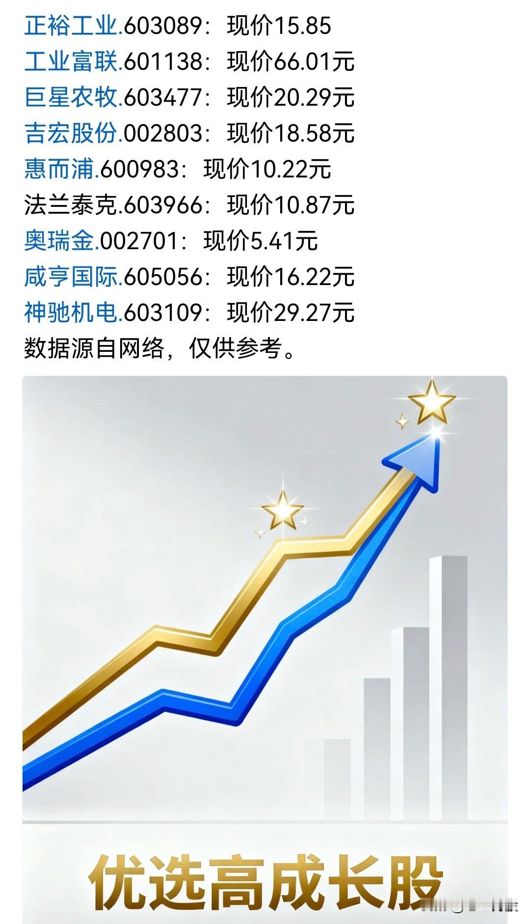 精选优质高成长股(信息列表) - 涉及行业包括环保、制造、通信、黄金、信息技术、机械、房地产、医药等。 - 部分代表性公司及股价: - 移远通信(603236):105.12元 - 华勤技术(603296):105.36元 - 浪潮信息(000977):74.42元 - 中国中车(601766):7.47元 - 中华企业(600675):2.95元 - 正裕工业(603089):15.85元 - 工业富联(601138):66.01元 - 巨星农牧(603477):20.29元 - 吉宏股份(002803):18.58元 - 惠而浦(600983):10.22元 - 法兰泰克(603966):10.87元 - 奥瑞金(002701):5.41元 - 咸亨国际(605056):16.22元 - 神驰机电(603109):29.27元