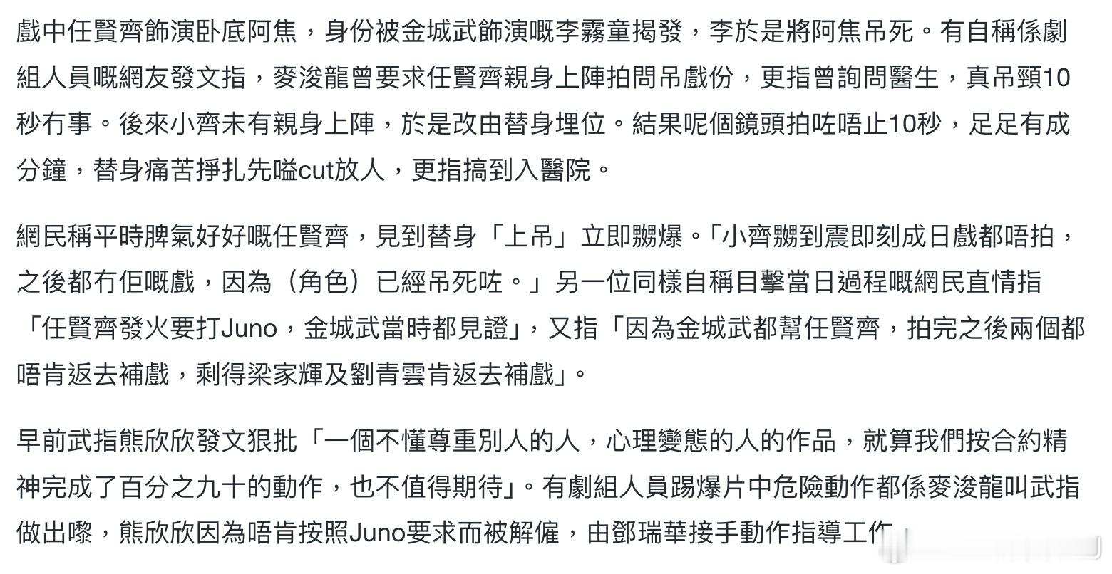所以看到网传的任贤齐因为麦浚龙追求效果不顾演员安危坚持让替身演员被吊足一分钟而发火走人,我也不太惊讶,因为电影里面那些追求形式到已经有点强迫症的画面已经告诉了你导演很偏执。为今之计,是学《梅艳芳》出个导演剪辑版迷你剧卖平台,哪怕不为挽回个人口碑,也要对得起坂本龙一的配乐和金城武最后的大银幕出演。